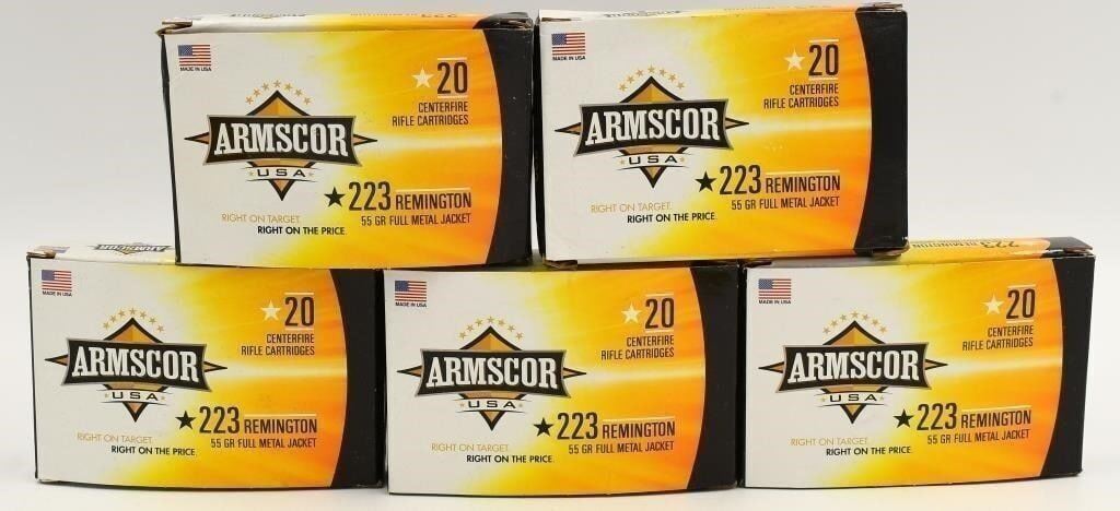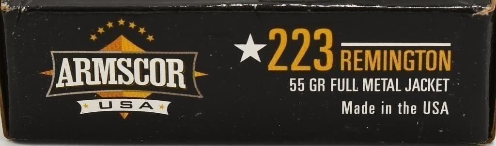 100 Rounds Of Armscor .223 Rem Ammunition , 55 Grain FMJ 3050 fps ARMSCOR USA ammunition line is made right here in the U.S.A. The Company offers a wide selection of competitively priced ammunition and components with sales spread throughout the world. ARMSCOR, an ISO 9001 Certified Company, complies with the SAAMI, CIP and other military or customer desired standards or requirements ARMSCOR cartridges and components are widely used by the police, military, gun hobbyist, combat shooters and other shooting enthusiast due to its high quality, precise and dependable performance. Armscor USA Ammunition Specifications and Features: Armscor F AC 223-1N .223 Remington 55 Grain Full Metal Jacket Lead Core Copper Jacket Brass Cased Boxer Primed Reloadable Non-Corrosive Muzzle Velocity 3050 fps Muzzle Energy 1136 ft/lbs Uses: Target Shooting, Training, and Plinking