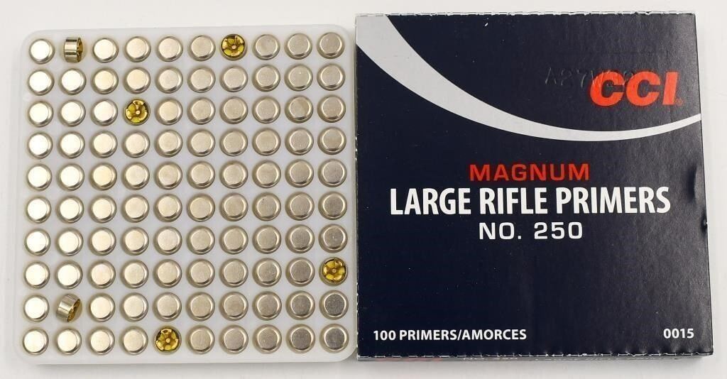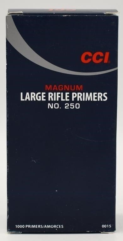 1000 Count CCI Large Rifle Magnum Primers #250 Box of 1000 (10 Trays of 100) CCI Primers are continuously tested and improved. As a result today's CCI primers are more sensitive, easier to seat and more compatible with progressive and automated loading equipment than ever before. They utilize modern non-corrosive and non-mercuric initiator mixes for the cleanest burn possible.