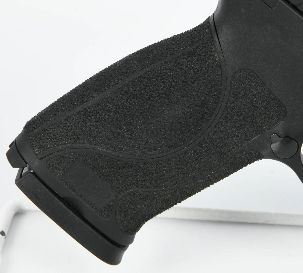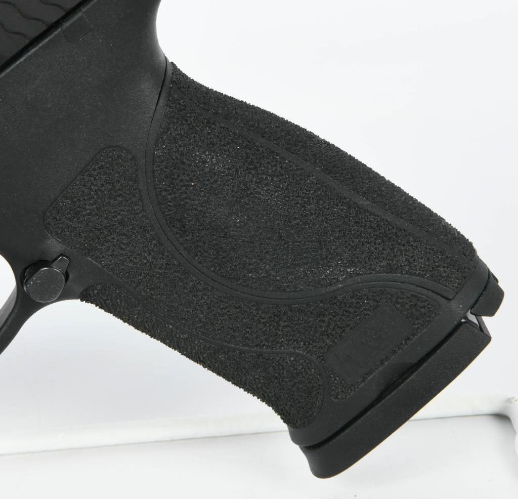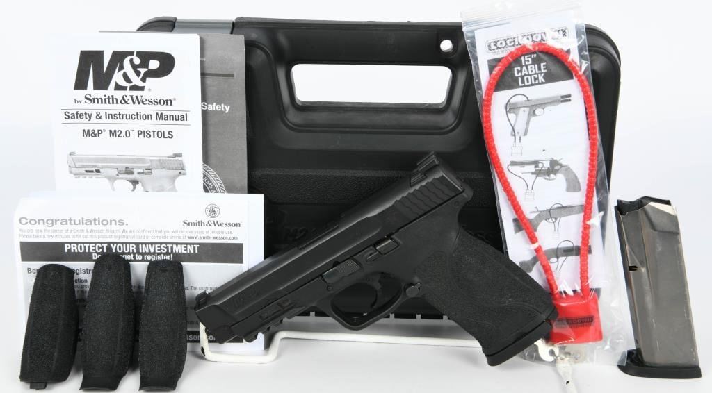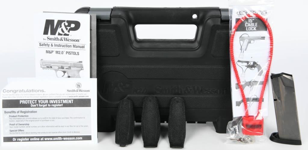 Introducing the Smith & Wesson M&P45 M2.0 Semi Auto Handgun, chambered in .45 ACP. This handgun features a 4.6" barrel and comes with two 10-round magazines. Notably, it is equipped with the Armornite finish in matte black, providing a durable and corrosion-resistant coating. The M&P M2.0 series represents the latest evolution of Smith & Wesson's renowned M&P line, known for its reliability and performance. This model includes several enhancements, such as the new M2.0 crisp trigger with a lighter pull, a tactile and audible trigger reset, and an accurate M&P M2.0 barrel. The design incorporates a high grip-to-barrel bore axis, contributing to a more comfortable shooting experience. The proven 18-degree grip angle ensures a natural point of aim, enhancing overall accuracy. The handgun comes with four interchangeable palmswell grip inserts, allowing for a more customized and optimal hand fit. With a no-thumb-safety configuration, this M&P45 M2.0 comes in the factory hardcase and appears to be in excellent condition. Smith & Wesson's commitment to quality and innovation is evident in the M&P M2.0 series, making it a reliable and performance-driven choice for firearm enthusiasts. Bid confidently on this well-maintained handgun to add a trusted and modern firearm to your collection.