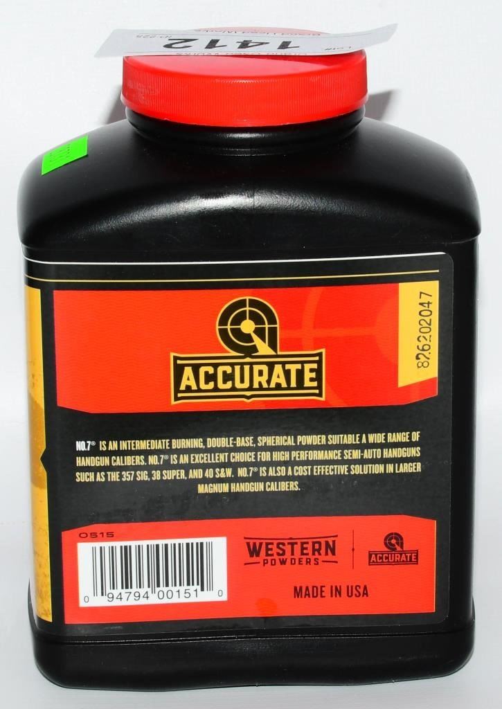 1 Lb Container Of Accurate No. 7 Handgun Powder Accurate No. 7 is an intermediate burning, double-base, spherical powder suitable for a wide range of handgun calibers. No. 7 is an excellent choice for high performance semi-auto handguns such as the 357 Sig, 38 Super, and 40 S&W. No. 7 is also a cost effective solution in larger magnum handgun calibers. Made in the USA.