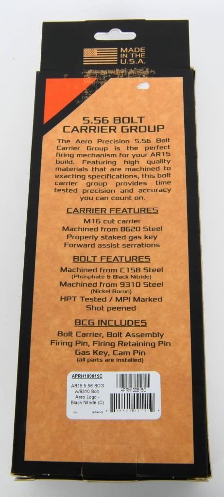 Firearm Enthusiasts, an outstanding opportunity is here! Presenting the NIB (New In Box) Aero Precision 5.56 Bolt Carrier Group. This top-tier BCG, in a sleek black color, is machined from durable 8620 steel. Seize the chance to upgrade your AR with the precision-crafted Aero Precision 5.56 Bolt Carrier Group, still sealed in the box. Bid now and elevate your shooting experience with the quality and reliability of this top-notch BCG! Happy bidding!