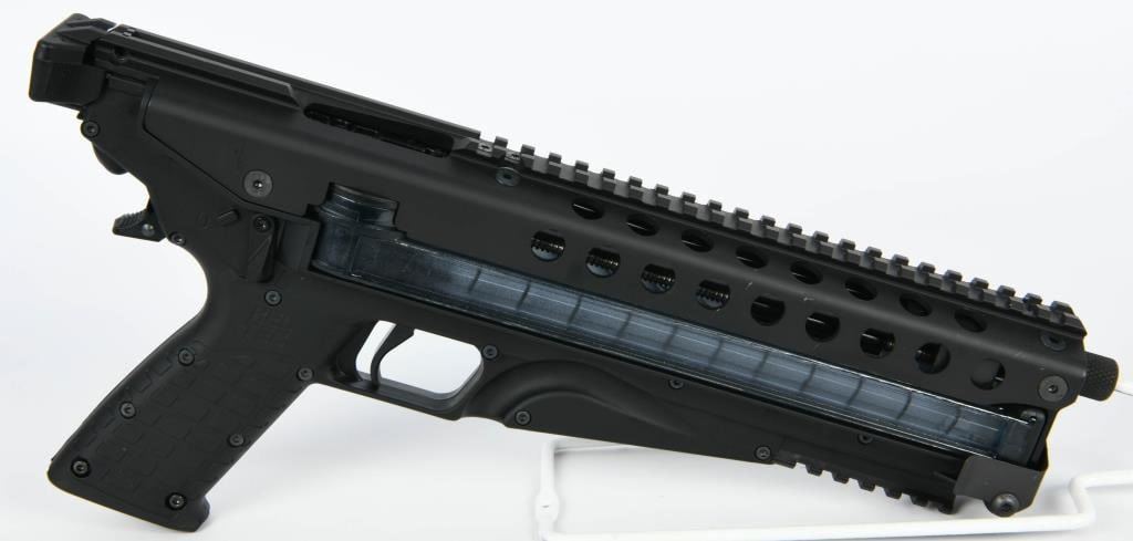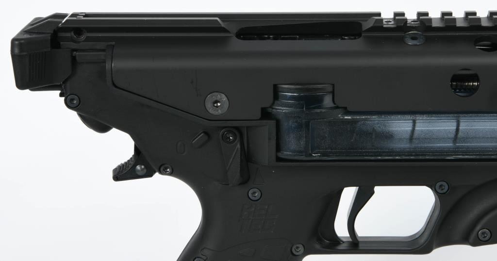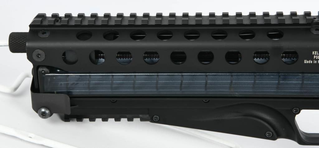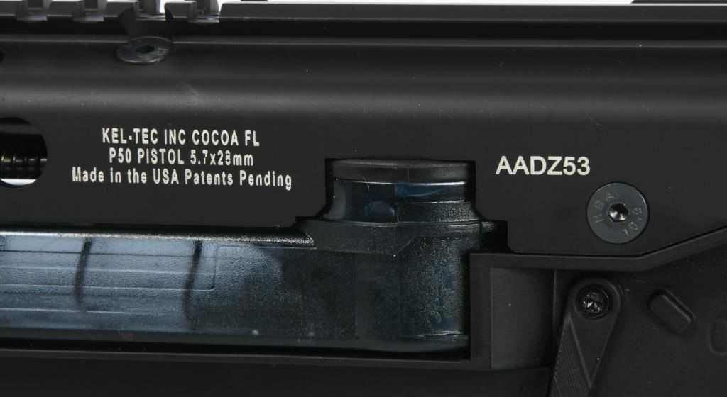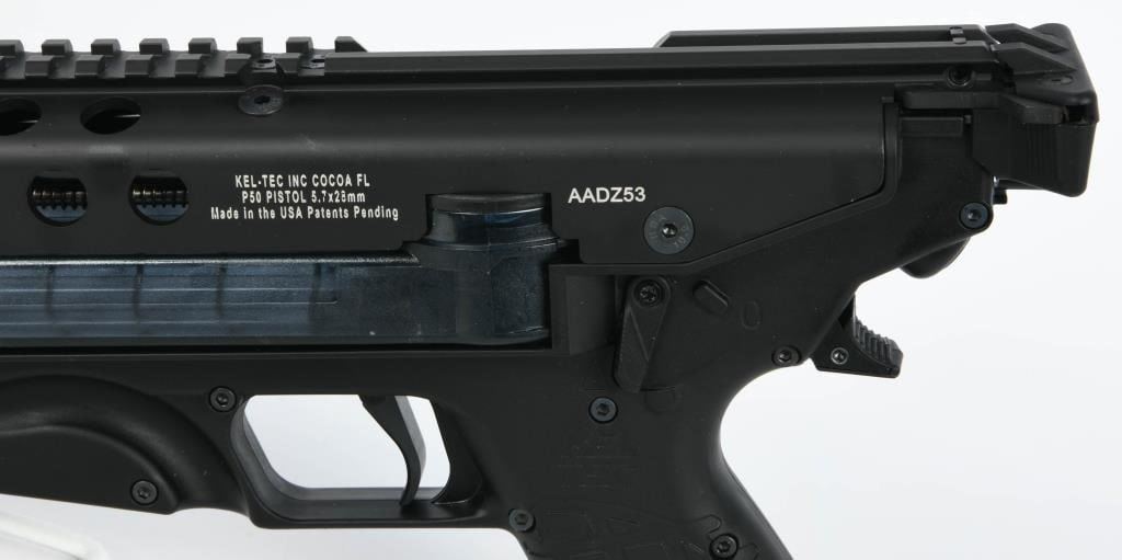 Introducing the Kel-Tec P50, a semi-automatic pistol chambered in 5.7x28mm that comes with a robust 50-round capacity, utilizing FN P90-style magazines. Designed based on the requests of Kel-Tec fans, the P50 aims to deliver a powerful and unique shooting experience. The Kel-Tec P50 features a distinctive recoil system that provides a soft-shooting and manageable experience. The upper receiver incorporates a combination of materials, using aluminum for non-critical parts, steel for critical components, and a polymer lower to keep overall weight down. This combination ensures flawless operation and durability. Equipped with ambidextrous controls, including a charging handle, safety selector, and magazine release switch, the P50 offers versatility and ease of use. The pistol utilizes a break-action design, allowing easy removal of the empty magazine while replacing it with a fresh one. Owners of PS90 or AR-57 firearms can use the same 50-round magazines on the Kel-Tec P50. One notable feature of the P50 is its top ejection system, with spent cases ejecting at a 90-degree angle to the right. As the 5.7x28mm cartridge experiences a renaissance, the Kel-Tec P50 emerges as an innovative addition to the world of semi-automatic pistols, meeting the demands of enthusiasts who sought a 5.7x28mm platform from Kel-Tec.