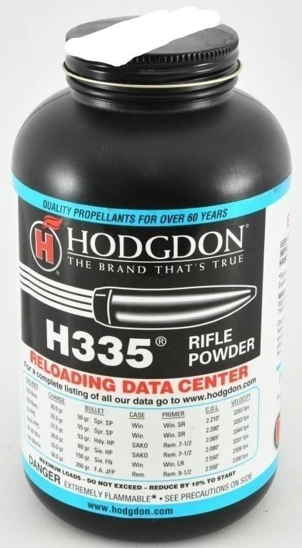 1 lb Container Of Hodgdon H335 Rifle Gun Powder Spherical Rifle Gun Powder Hodgdon H335 Spherical Rifle Powder was originally used by the military, specifically the .223 Remington and 5.56 NATO, but today, it remains a popular choice for small cartridges when hunting squirrels, prairie dogs, and other small game. This powder is an affordable choice for reloading and comes with a solid backing from the manufacturer.