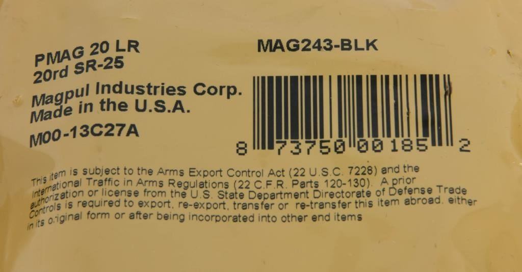 4 New in The Package Magpul PMAG 20LR Magazines LR-308, KAC SASS/MK11 308 Winchester 20-Round Polymer Black The MagPul 20LR PMag is constructed from advanced polymers with superior impact resistance and light weight. This 20-Round magazine is designed to replace the standard SR25/ M110 pattern magazines. The 20LR is less than half the weight of a standard steel mag and has a true 20-round capacity. The body is designed with a constant-curve inside dimension and a self-lubricating follower for reliable feeding. The textured magazine body and flared floorplate improve handling over standard magazines. The snap-on impact cover protects the feed lips from impacts and debris while in storage. The impact cover also allows loaded magazines to be stored long-term (over 1 year) without compromising the integrity of the feed lips. The design of the floor plate is simple to disassemble using the impact cover or simple punch for cleaning and maintenance. Technical Information: 20-Round Capacity Available in Black Anti-Tilt Follower and Stainless Steel Spring Will accept rounds with a maximum overall length of 2.820" Impact cover to protect feed lips Accepts standard MagPul Magazine Pull for AR10/ LR-308 Know Your State Laws Before Bidding On High Capacity Magazines