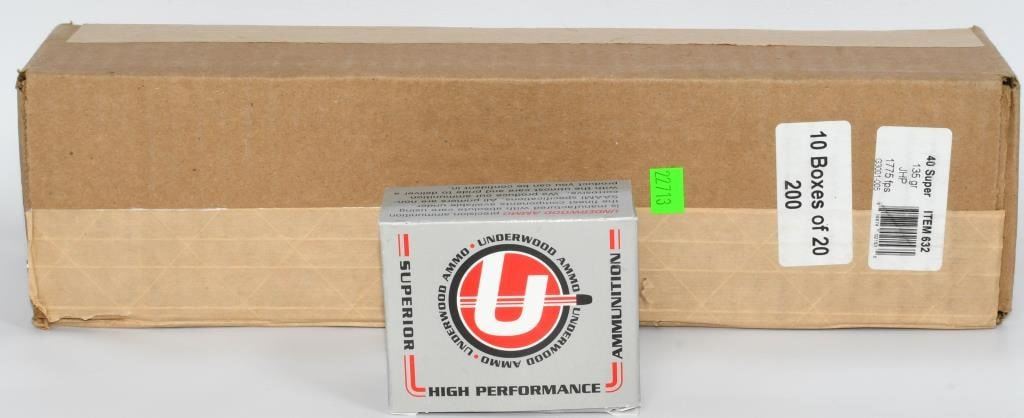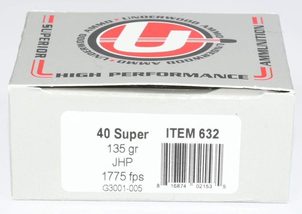 Secure 140 rounds of Underwood .40 Super ammunition, featuring high-performance 125-grain Jacketed Hollow Point (JHP) projectiles designed for optimal stopping power. Underwood is recognized for its commitment to precision and reliability, making this ammunition an excellent choice for personal protection. The 125-grain JHP bullets are engineered for controlled expansion upon impact, ensuring effective performance in self-defense scenarios. With Underwood's high-performance design, this ammunition provides the confidence and reliability needed for personal protection. Bid confidently on this opportunity to acquire 140 rounds of Underwood .40 Super ammunition, enhancing your self-defense capabilities with high-quality, jacketed hollow point rounds. Note: Please ensure compliance with local and state regulations regarding the purchase and possession of ammunition.