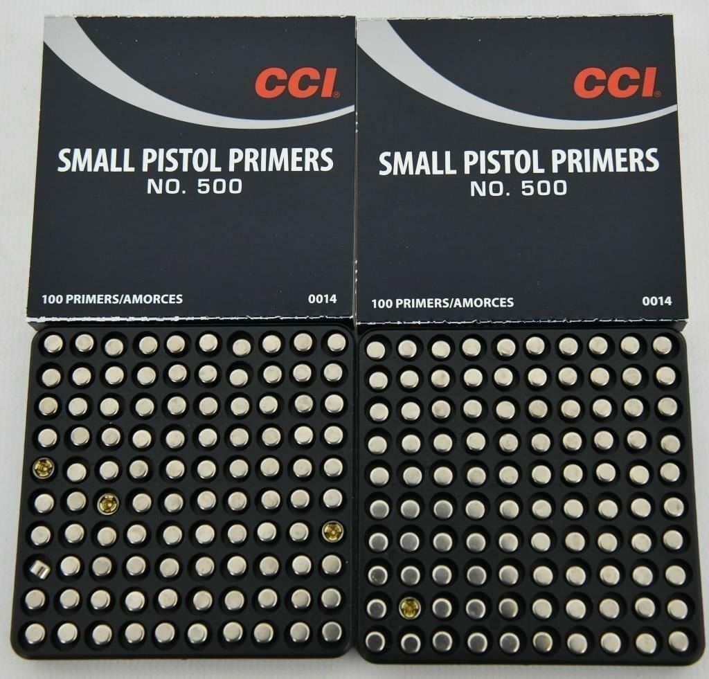 1000 Count CCI #500 Standard Small Pistol Primers Up Next We Have a Lot of 1000 CCI Standard Small Pistol Primers #500, CCI Primers are continuously tested and improved. As a result today's CCI primers are more sensitive, easier to seat and more compatible with progressive and automated loading equipment than ever before. They utilize modern non-corrosive and non-mercuric initiator mixes for the cleanest burn possible. These are the ?bread-and-butter? of reloading, the most commonly called-for primers in reloading recipes. CCI standard primers are remarkably clean-burning, leaving primer pockets cleaner and extending the time between pocket cleaning. That?s a huge benefit for progressive reloaders. They are more sensitive and easier to seat than older CCI primers, and engineered for smooth feeding in automated equipment. NO HAZMAT FEES!!!