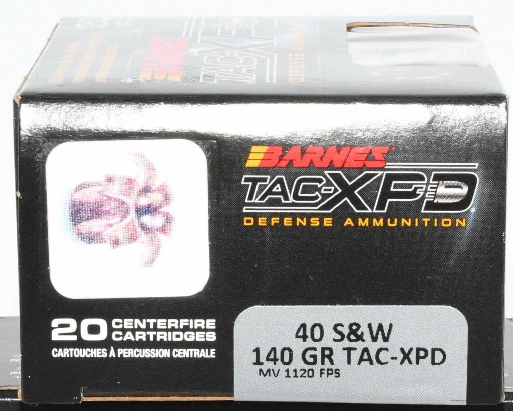 40 Rds of Barnes .40 S&W Tac-X PD Ammunition, Barnes .40 S&W 140 Grain TAC-XP HP Barnes' New TAC-XPD ammunition provides you with all of the solid copper consistency, penetration, mass retention, and reliable expansion you expect from Barnes, in factory loaded ammunition. The Barnes TAC-XP Bullet has a deep hollow point cavity and will form sharp petals, tracking straight, even through intermediate barriers such as plywood, sheet metal, and glass. Cases are nickel plated for high visibility, and reliable feeding in a variety of firearms. .40 Smith & Wesson 140 Grain Barnes TAC-XP Lead Free Solid Copper Hollow Point Bullet Brass Cased Nickel Coated Cases Reloadable Muzzle velocity: 1120 fps Muzzle energy: 390 ft/lbs Uses: Self Defense or Personal Protection
