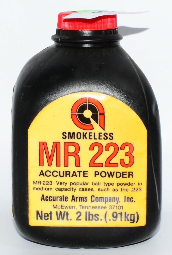 2 Lb Container Of Accurate MR 223 Gun Powder, Note Container Is Not Full And Weighs Only 1 Lb 4 Oz , MR-223 Very Popular Ball Type Powder In Medium Capacity Cases Such As .223