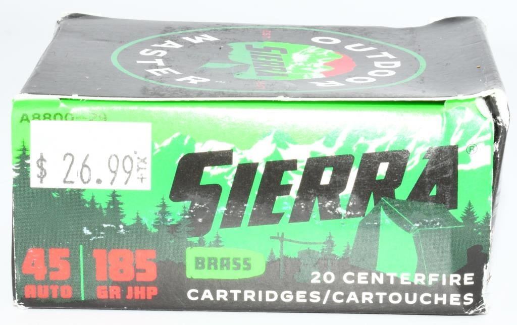 Secure 40 rounds of Sierra .45 ACP JHP ammunition, featuring Outdoor Master 185-grain Jacketed Hollow Point (JHP) rounds with brass casings. Crafted for precision and reliable performance, Sierra and Outdoor Master are trusted names in the ammunition industry. The 185-grain JHP construction ensures controlled expansion upon impact, making these rounds well-suited for self-defense or other applications where stopping power is crucial. Encased in high-quality brass, these rounds provide smooth feeding and consistent cycling in your .45 ACP firearms. Bid confidently on this opportunity to acquire 40 rounds of Sierra .45 ACP JHP ammunition by Outdoor Master, enhancing your shooting experience with high-quality, jacketed hollow point rounds. Note: Please ensure compliance with local and state regulations regarding the purchase and possession of ammunition.