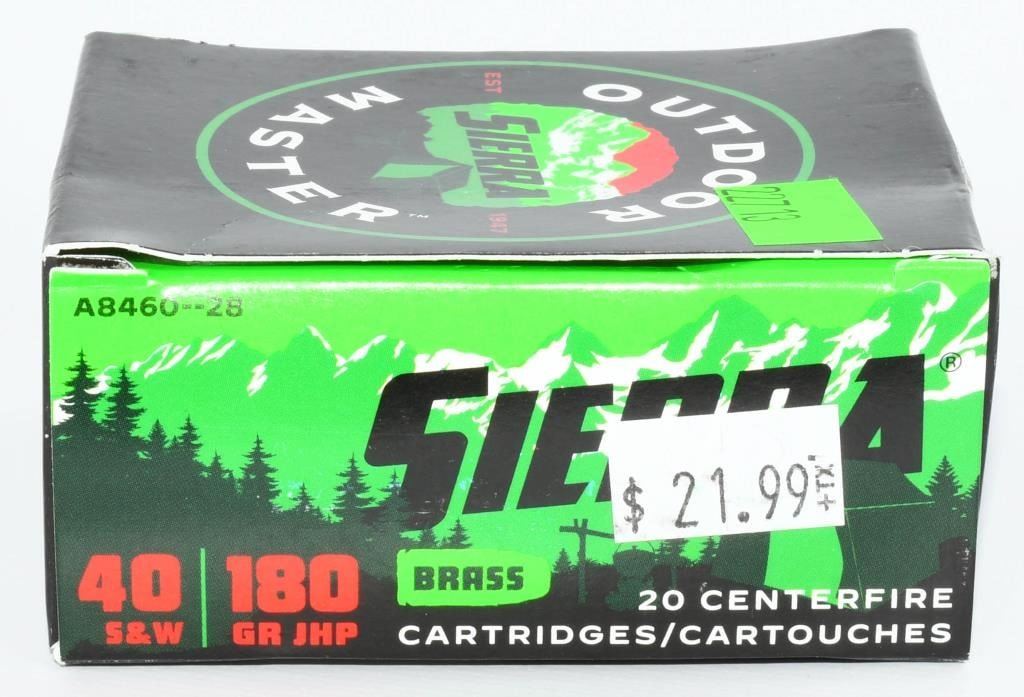 Secure 40 rounds of Sierra .40 S&W JHP ammunition, featuring reliable brass-cased construction and potent 180-grain Jacketed Hollow Point (JHP) bullets. Sierra is renowned for its precision and performance, making this ammunition an excellent choice for self-defense and personal protection. The 180-grain JHP bullets are designed for controlled expansion upon impact, providing effective stopping power. The brass casing ensures smooth feeding and reliable cycling in your .40 S&W firearms, contributing to a trustworthy shooting experience. Bid confidently on this opportunity to acquire 40 rounds of Sierra .40 S&W JHP ammunition, enhancing your self-defense capabilities with high-quality, brass-cased, jacketed hollow point rounds. Note: Please ensure compliance with local and state regulations regarding the purchase and possession of ammunition.