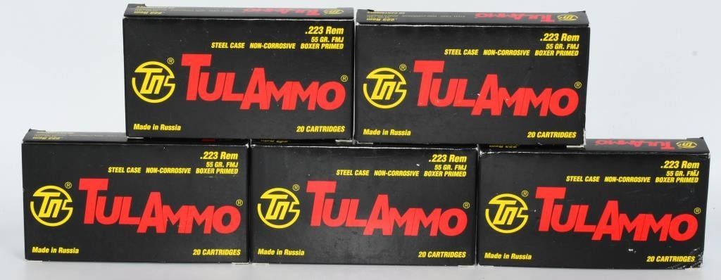 Secure 100 rounds of Tulammo .223 Rem ammunition, featuring a 55-grain full metal jacket with a steel case. Crafted for reliable and cost-effective performance, Tulammo is known for providing affordable options for a variety of shooting applications. The 55-grain full metal jacket construction ensures smooth feeding and reliable cycling in your .223 Rem firearms. With non-corrosive Boxer priming, these rounds offer convenience and reliability. Whether you're at the range for practice or engaging in training sessions, these rounds provide consistent performance. Bid confidently on this opportunity to acquire 100 rounds of Tulammo .223 Rem ammunition and enhance your shooting experience with cost-effective and reliable rounds. Note: Please ensure compliance with local and state regulations regarding the purchase and possession of ammunition.