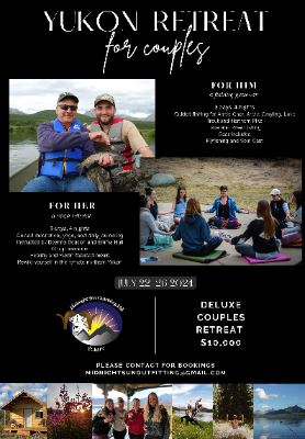 Midnight Sun Outfitting is delighted to donate a Deluxe Couple Retreat, inviting one fortunate couple to a captivating adventure in the pristine landscapes of the northern Yukon. Nestled within the federally protected Peel River Watershed, this retreat promises an untouched wilderness experience, far from industrial interference. Tailored to cater to diverse interests, the retreat offers thrilling activities for both partners. For 'Him,' indulge in a fishing expedition targeting Arctic Grayling, Lake Trout, Northern Pike, and Arctic Char, complemented by exciting horseback adventures and guided hikes. 'Her' experience includes life coaching, yoga, journaling, intuition coaching, meditation, and more, led by experts Deanna Deacon and Emma Hull. Choose from horseback rides, day hikes, fishing, swimming, aerial tours, birdwatching, and wildlife viewing, all set against the stunning Yukon backdrop. Our off-grid cabins and lodge offer rustic charm with modern amenities like WiFi, hot showers, and a sauna. Revel in gourmet meals showcasing local Yukon cuisine, fostering a perfect balance between rustic retreat and contemporary comfort. Disconnect from the world, immerse yourselves in nature, and forge meaningful connections during this 4-day retreat from July 22nd to 26th, 2024, with Dawson City, Yukon, Canada, as the arrival and departure point (flight not included). For more information, contact Jesse Young by email at midnightsunoutfitting@gmail.com or by phone at 403-813-8589. Company's website: www.midnightsunoutfitting.com