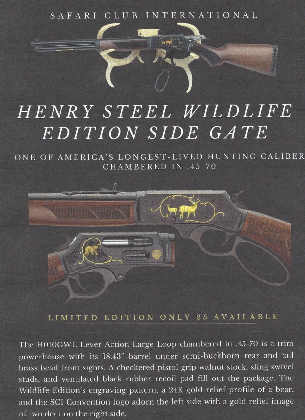 Now is your chance to own one of the most beautiful rifles around!! This is a limited edition with only 25 available. The H010GWL Lever Action Large Loop chambered in .45-70 is a trim powerhouse with its 18.43" barrel under semi-buckhorn rear and tall brass bead front sights. A checkered pistol grip walnut stock, sling swivel studs, and ventilated black rubber recoil pad fill out the package. The Wildlife Edition's engraving pattern, a 24K gold relief profile of a bear, and the SCI Convention logo adorn the left side with a gold relief image of two deer on the right side.