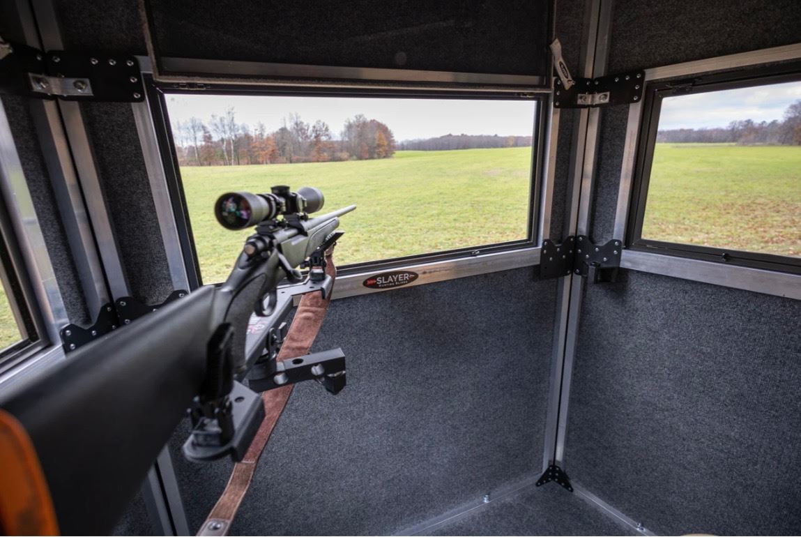 The Slayer Gun Blind is a 5-sided blind with horizontal gun windows that can be used for gun or crossbow hunting. This is a permanent, hard-sided hunting blind that is also modular. All 5 sides and the base can be taken apart and moved in minutes. The walls and base are fully carpeted to provide a quiet and comfortable interior. The side walls are 6’6” tall, the center ceiling height is 7’3”, and the interior floor plan measures over 6 feet from point to point. Includes large windows for both rifle and archery hunting! 6×6 hard sided blind, 5-Sided floor plan,