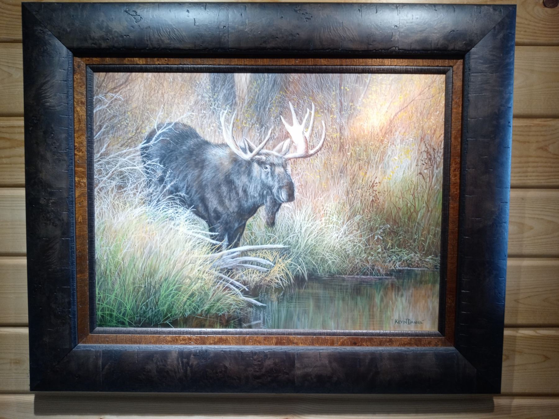 Majestic Descent by Kevin Daniel - Original Acrylic Painting 18 x 24 image size. In this painting we have a mature bull moose headed down to the lake for an evening bath and a drink. The autumn foliage provides a colorful backdrop for the beautiful animal. Minnesota SCI would like to thank Chris Knutson for this donation!