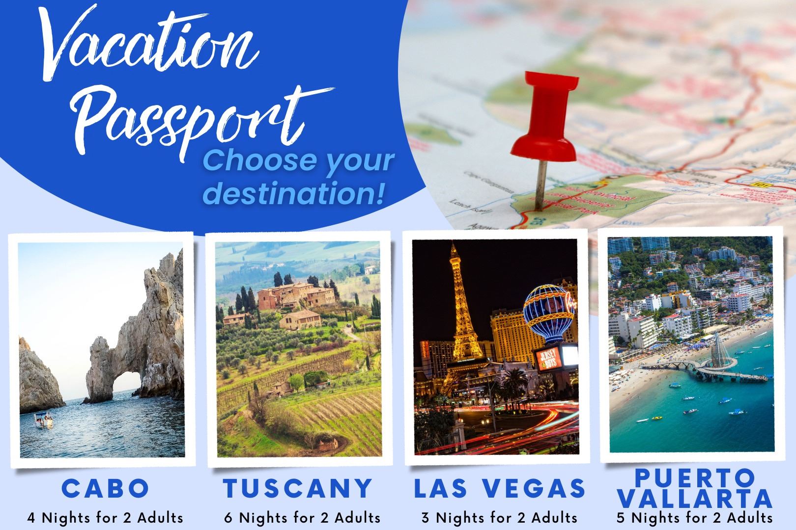 This travel package provides (2) adults with the choice of Puerto Vallarta All-Inclusive, Las Vegas, Tuscany, or Cabo All-Inclusive. Reservations must be booked at least 90 days in advance.