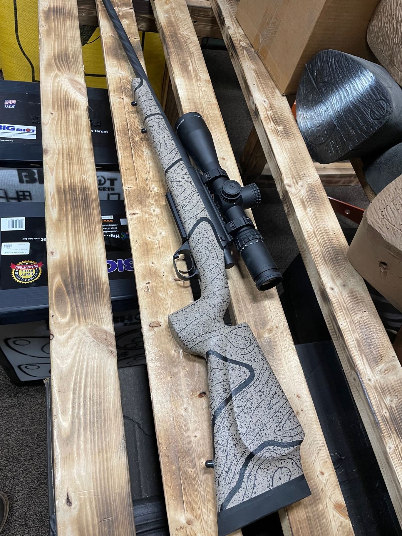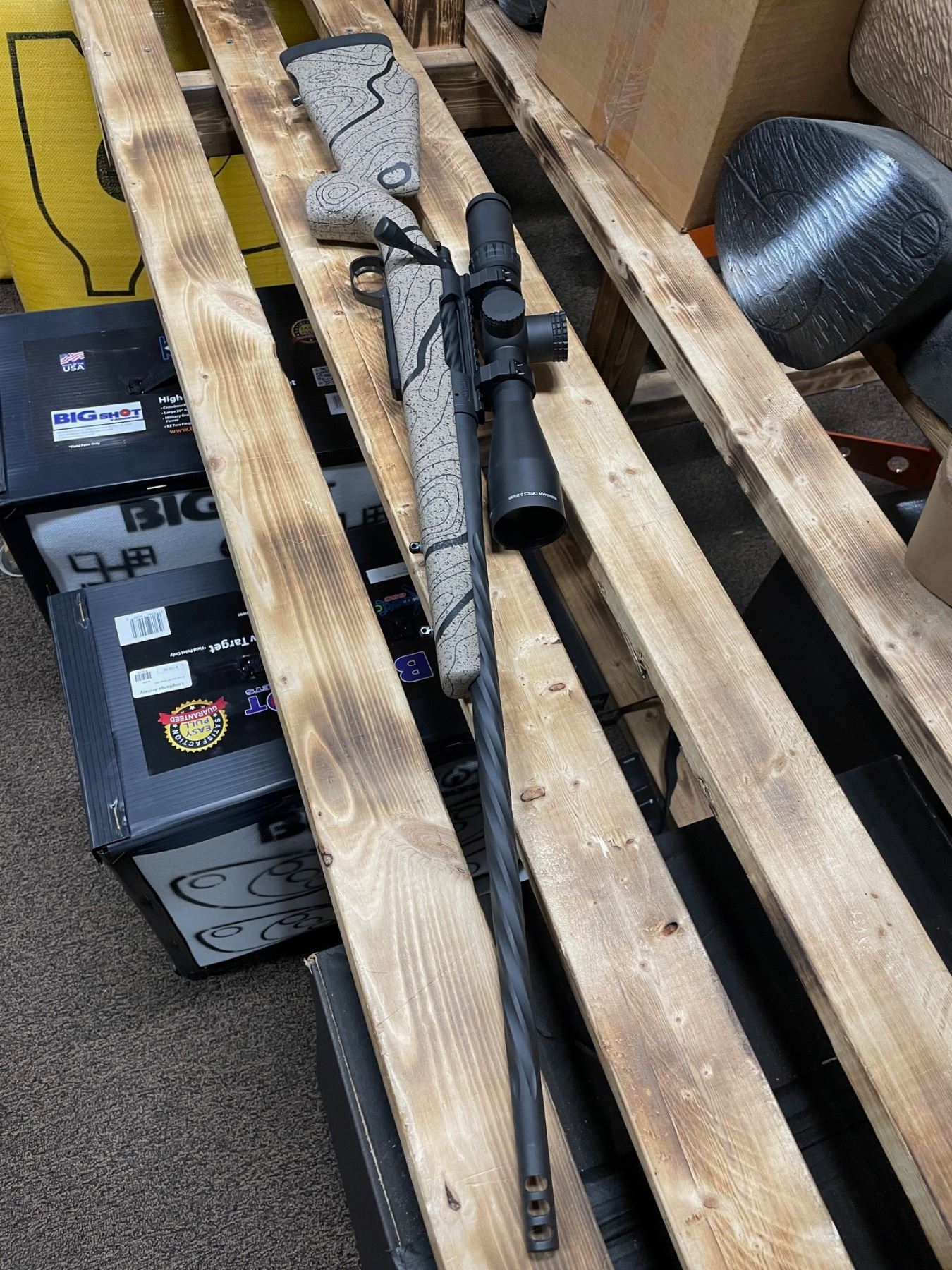 This rifle is chambered in the limited edition 7 PRC. The Hunt-Ready System Includes: The ALTOPO Shooting System which features a beautifully-crafted 24” spiral fluted and threaded barrel with a muzzle brake mounted on a McMillan Carbon Fiber Stock with a topographical map design finish and a TriggerTech trigger. The ALTOPO shooting system includes a Huskemaw 5-20x50 Blue Diamond scope, Talley Scope Rings, Dual Stack Turret with outer for 3000’ and inner for 7000’ and a Huskemaw Wind Meter. Factory-zeroed with proven accuracy to shoot sub-MOA groups at 1,000 yards, and also including a Boyt Lockable Hard Case and two boxes of factory ammo. This complete shooting system is ready for use straight out of the box!