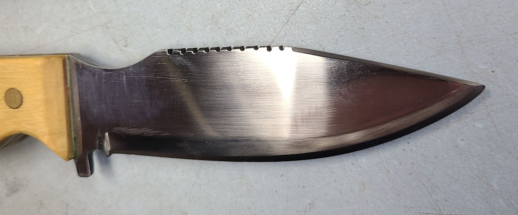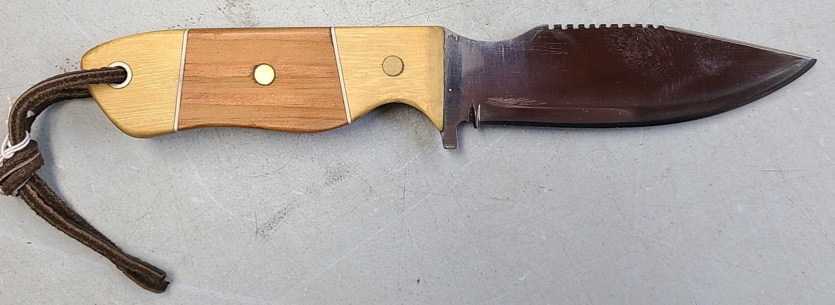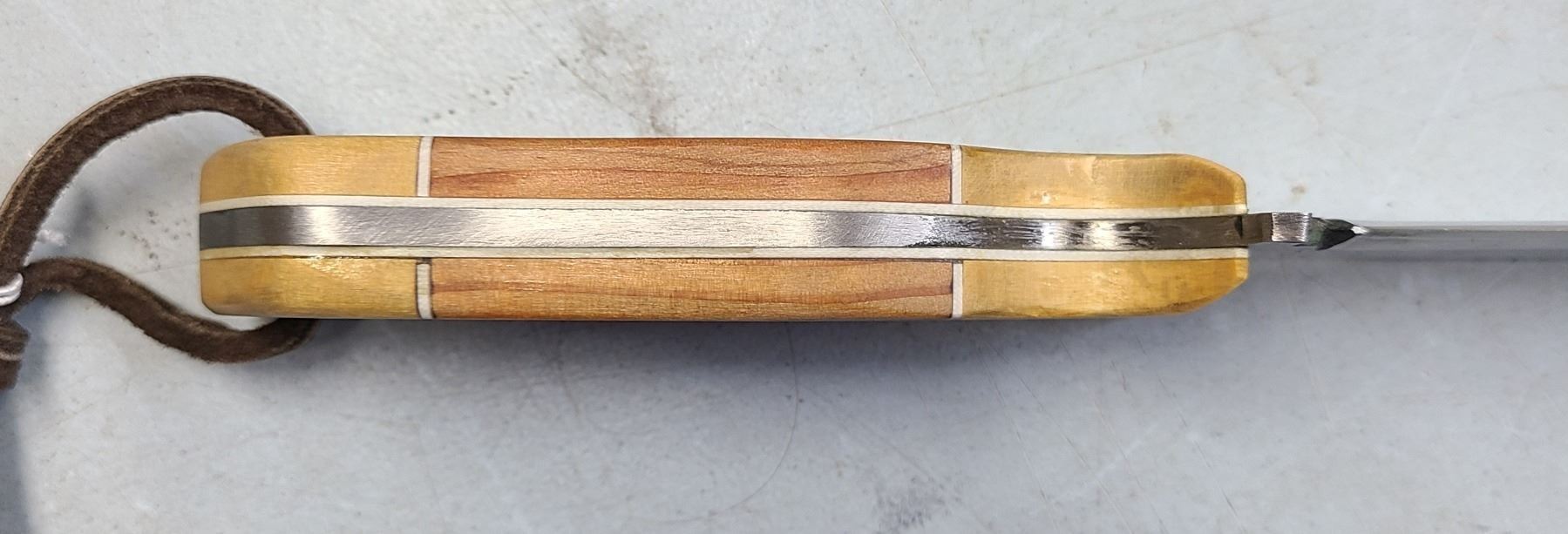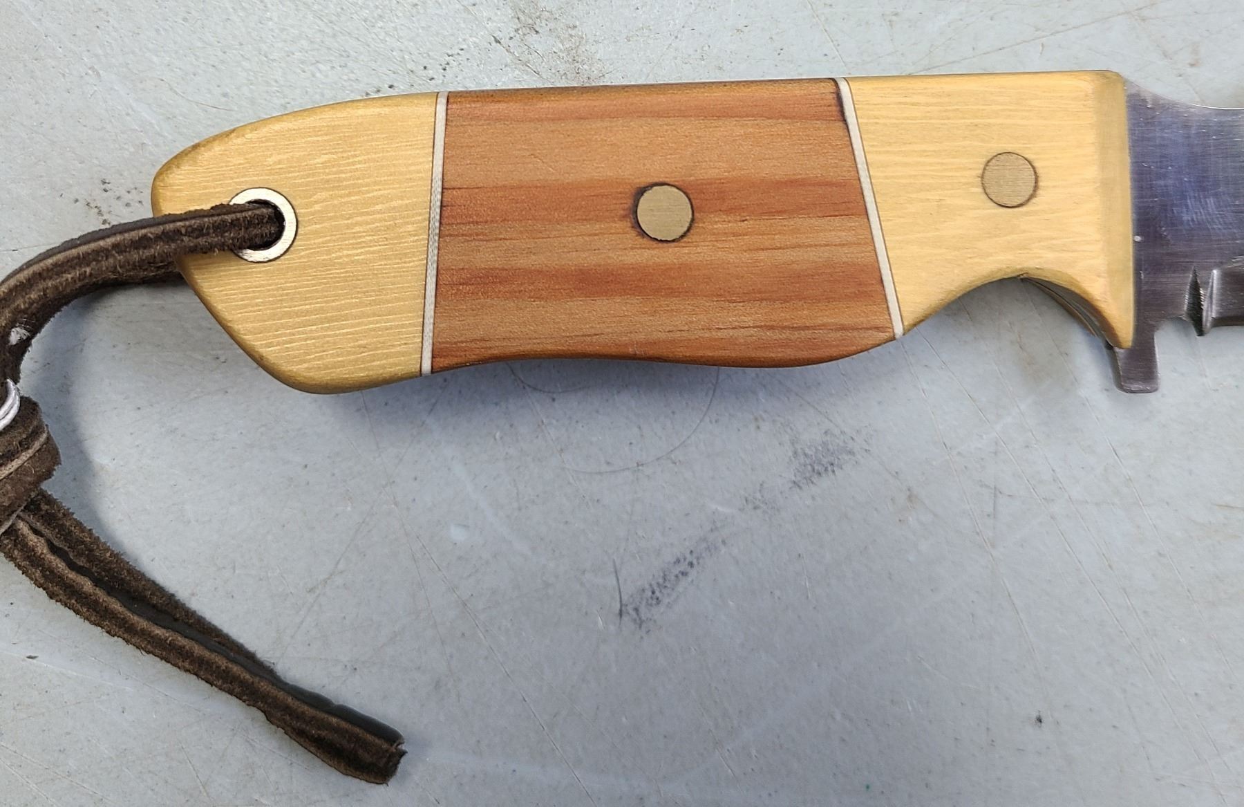 Knife is made from 1095 Carbon Steel with mixed Red and Yellow Cedar Handle.