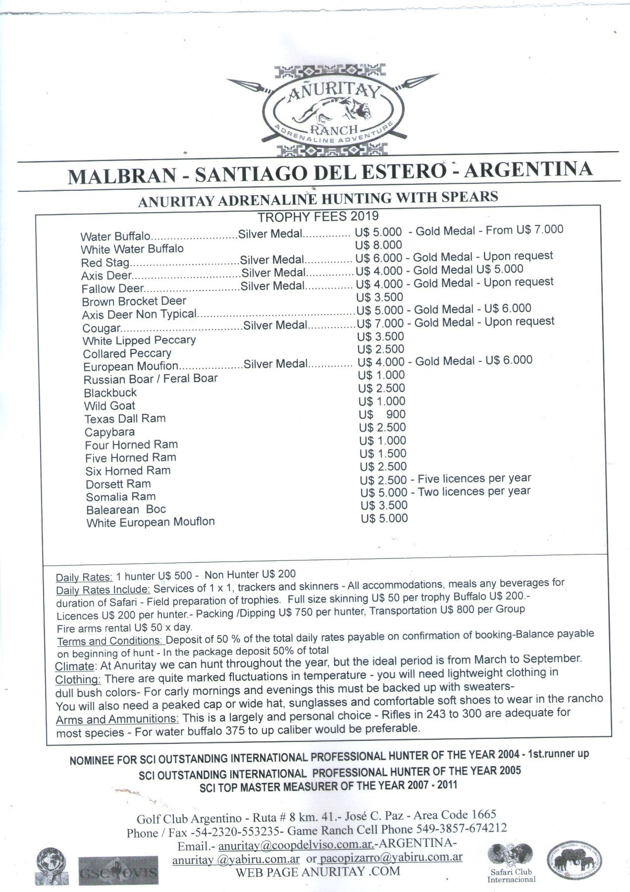 Argentina: Anuritay Ranch - Francisco "Paco" Pizarro of Anuritay Ranch is donating a 7-day big game hunt for two hunters. Included in the donation are trophy fees for 1 Boar, 1 Texas Dall Ram, and 1 Multi horned Goat per hunter (total of six trophies). The donation also includes luxury lodge accommodations, laundry service, meals, guide services (1 X 1), free use of guns (if desired)only pay for ammo used, trophy field prep, and caping/salting of trophies.