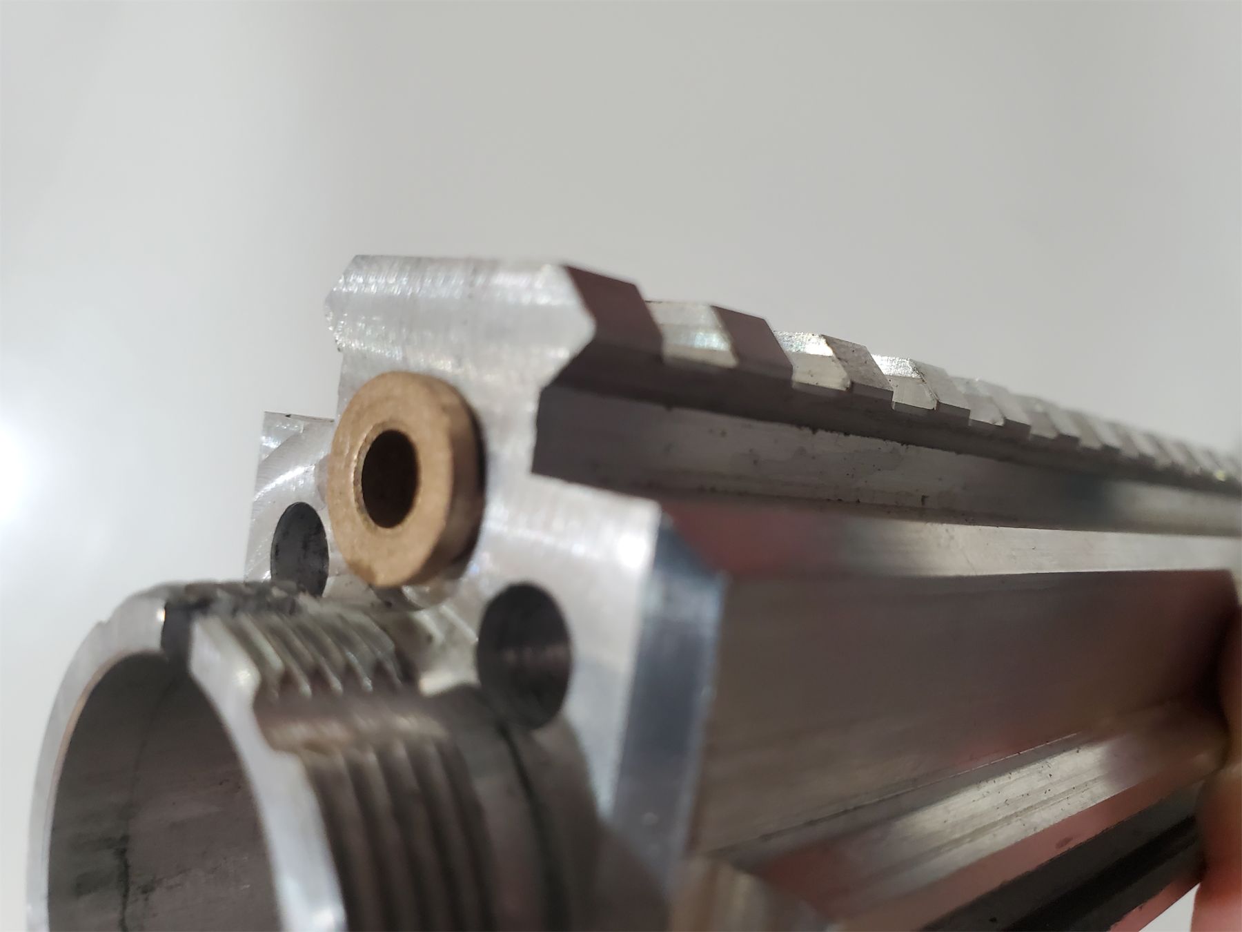 Gunsmith special! Enhanced Gen 2 upper with all the new features including built in shell deflector and dust cover detents. The hole for the brass bushing was drilled off-center so that the brass bushing doesn't sit flush, as shown in photos. Intended for an experienced gunsmith who can correct the misalignment.
