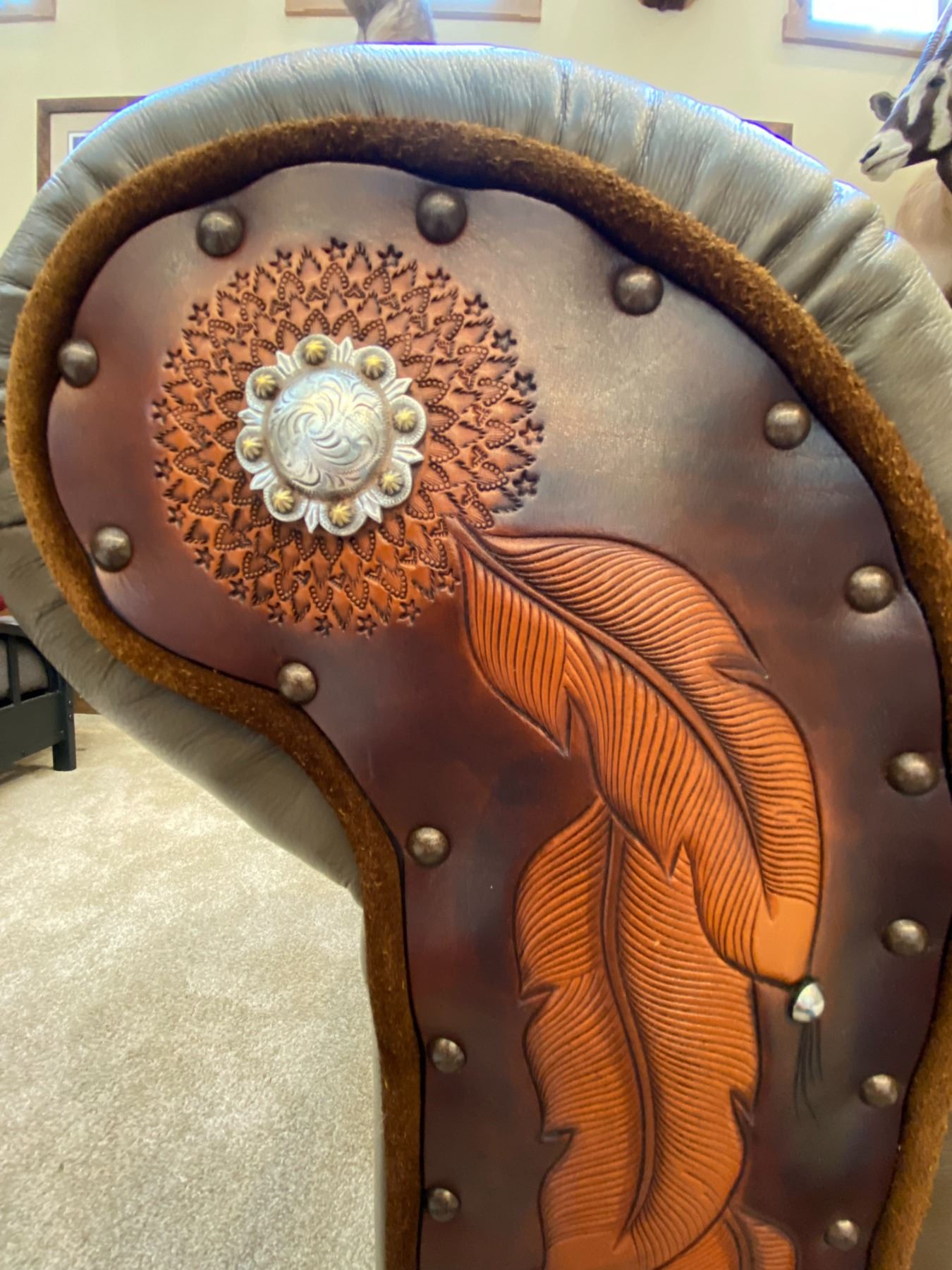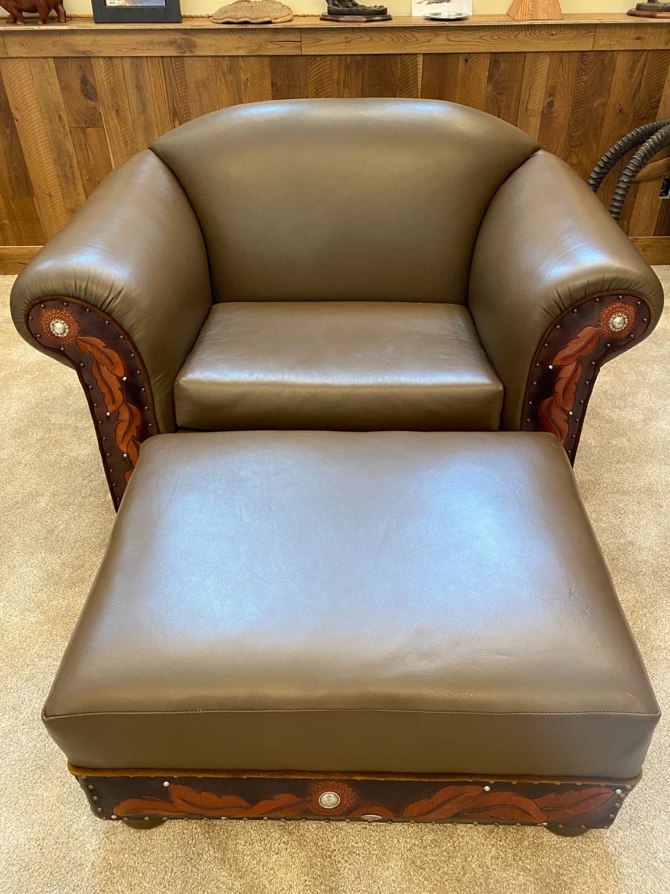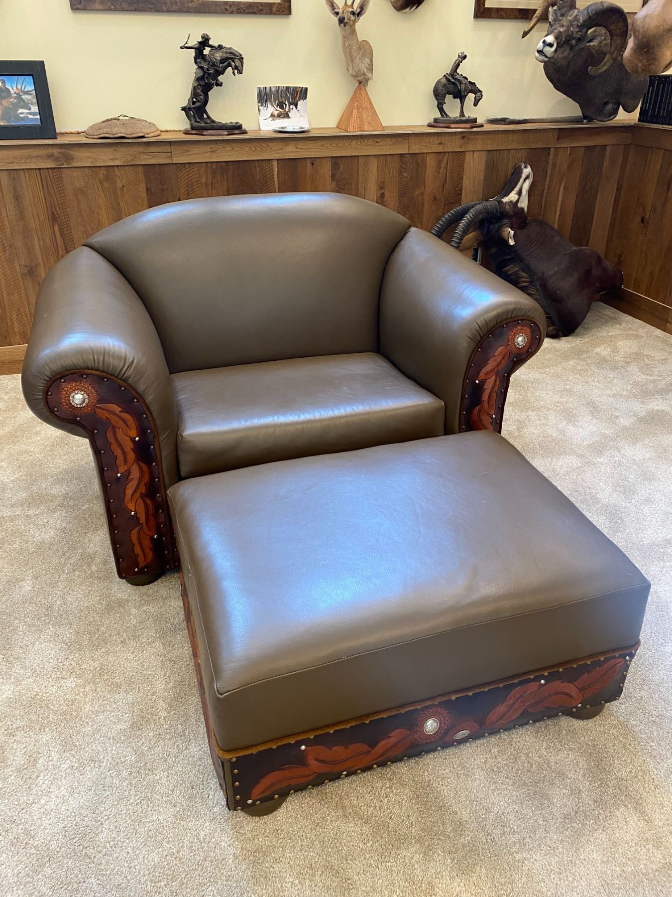 The detailed custom leatherwork on this Beautiful Apodaca Chair and Ottoman was hand-crafted with the finest materials, traditional craftsmanship, uncompromising dedication to detail and quality – these are the hallmarks of Lisa & Loren Skyhorse. There is no limit to the masterful hand carving and artwork by Lisa Skyhorse.