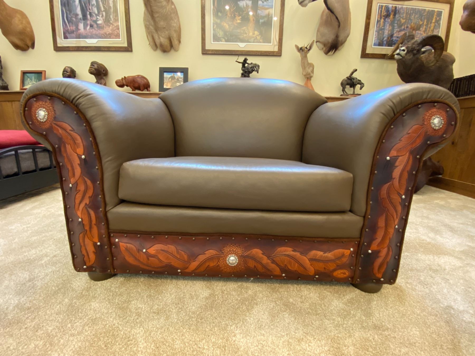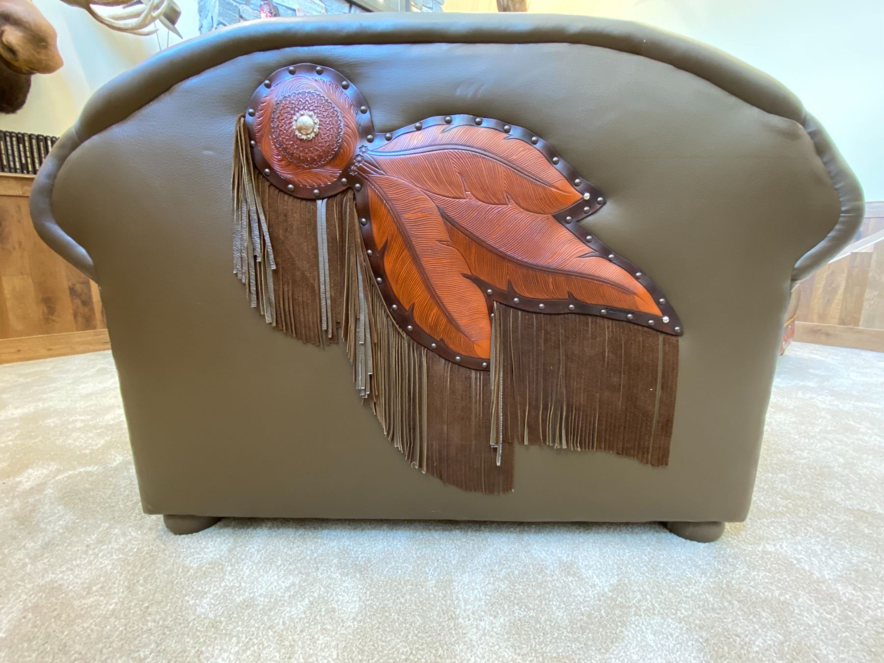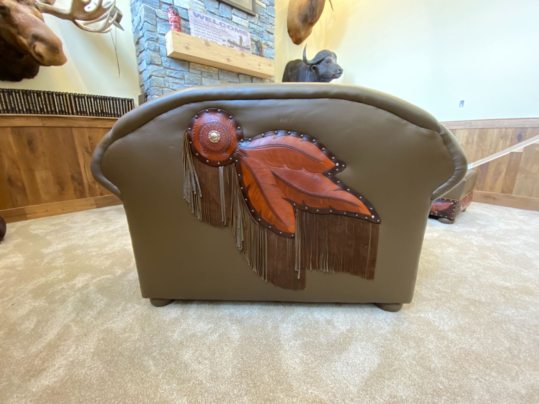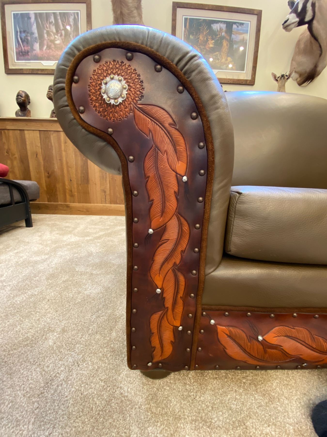 The detailed custom leatherwork on this Beautiful Apodaca Chair and Ottoman was hand-crafted with the finest materials, traditional craftsmanship, uncompromising dedication to detail and quality – these are the hallmarks of Lisa & Loren Skyhorse. There is no limit to the masterful hand carving and artwork by Lisa Skyhorse.