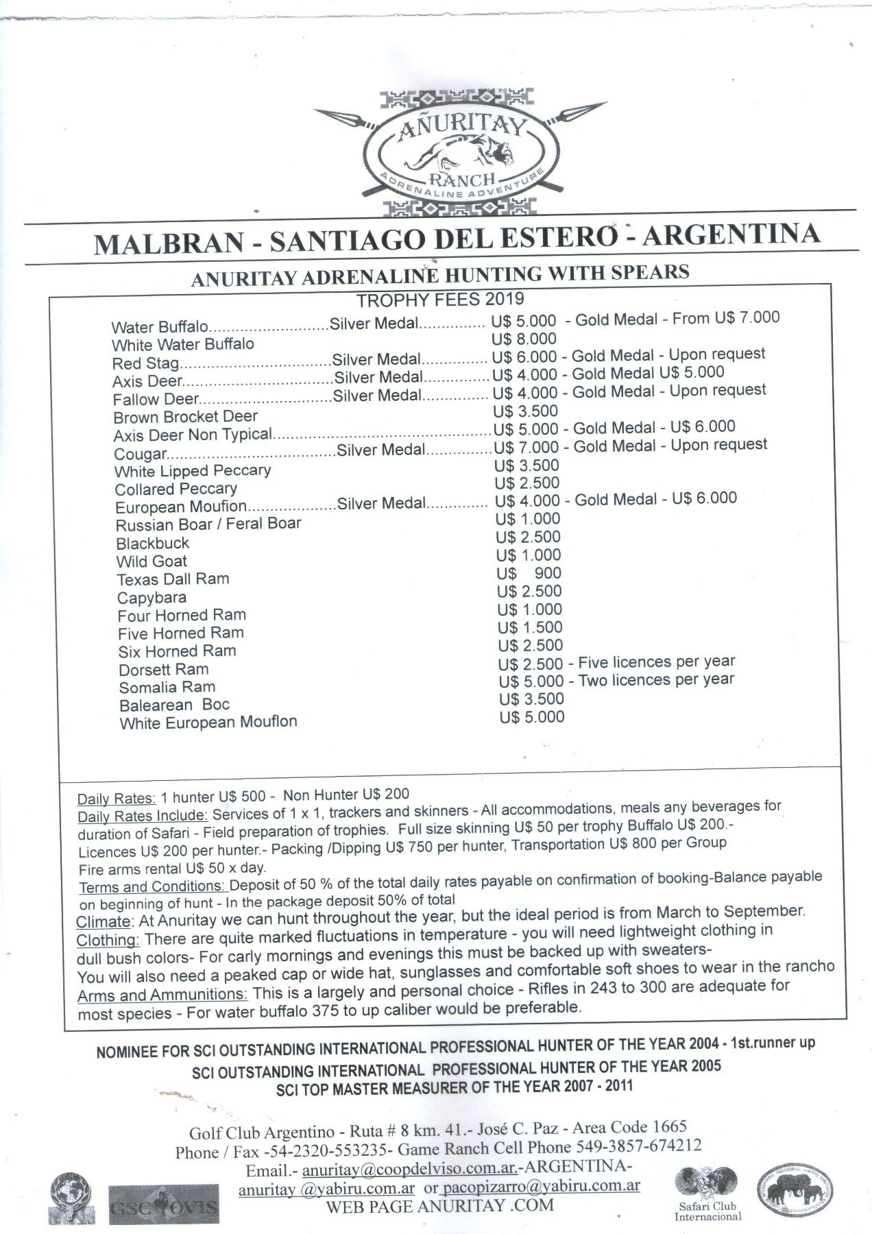 - Francisco "Paco" Pizarro of Anuritay Ranch is donating a 7-day big game hunt for two hunters. Included in the donation are trophy fees for 1 Boar, 1 Texas Dall Ram, and 1 Multihorned Ram per hunter (total of six trophies). 2024 SEASON –February to December The donation also includes luxury lodge accommodations, laundry service, meals, guide services (1 X 1), free use of guns (if desired), trophy field prep, and caping/salting of trophies.Not included are domestic/international airfares, hunting license ($200 per hunter), $800 ground transportation fee(roundtrip per group of up to 4 people) from Santiago del Estero airport to lodge round trip , packing and dipping of trophies and veterinary certificate ($750 per hunter), and tips. You will hunt 20,000 acres of land with 22 different species of big animals available. Extra days can be added at $500 per day. Additional trophies may be taken for the stated trophy fee: Red Stag, Fallow Deer, Axis Deer, Water Buffalo, Cougar, Brown Brocket Deer, White Lipped Peccary, Collared Peccary, Capybara, Mouflon, and more. "Paco" was the 2005 SCI International Professional Hunter of the Year. Method of take is hunter’s choice. Non hunter can be added for $200 per day. Additional hunter can be added for $500 per day. For more information, contact Paco Pizarro at Int’l Tel: +54 2320 553235 or by e-mail: anuritay92@gmail.com