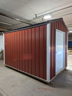 8x12 portable shed, shed, charcoal grey roof, red sides, white trim, 4 ft door, 3x3 window, building wrap, 26 gauge metal. Delivery Available Lovell, WY · Powell, WY · Cody, WY · Belfry, MT · Billings, MT · Red Lodge, MT and