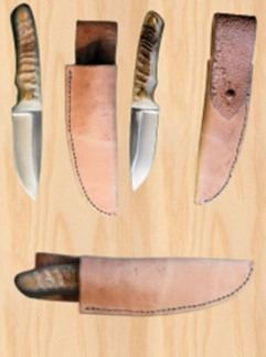 Drop point skinner, high carbon steel. Blade is 3 3⁄4” long and 1 3/8” wide at base by handle. Big Horn Sheep horn handle is 4 1⁄2” long. Leather sheath is 7 3⁄4” long, made for this knife.