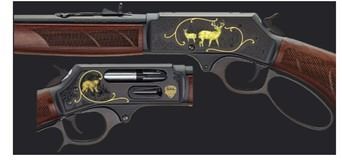The H010GWL Lever Action Large Loop chambered in .45-70 is a trim powerhouse with its 18.43” barrel under semi-buckhorn rear and tall brass bead front sights. A checkered pistol grip walnut stock, sling swivel studs, and ventilated black rubber recoil pad fill out the package. The Wildlife Edition’s engraving pattern, a 24K gold relief profile of a bear, and the SCI Convention logo adorn the left side with a gold relief image of two deer on the right side. Purchaser to pay 100% of shipping charge and any fees of their receiving FFL holder.