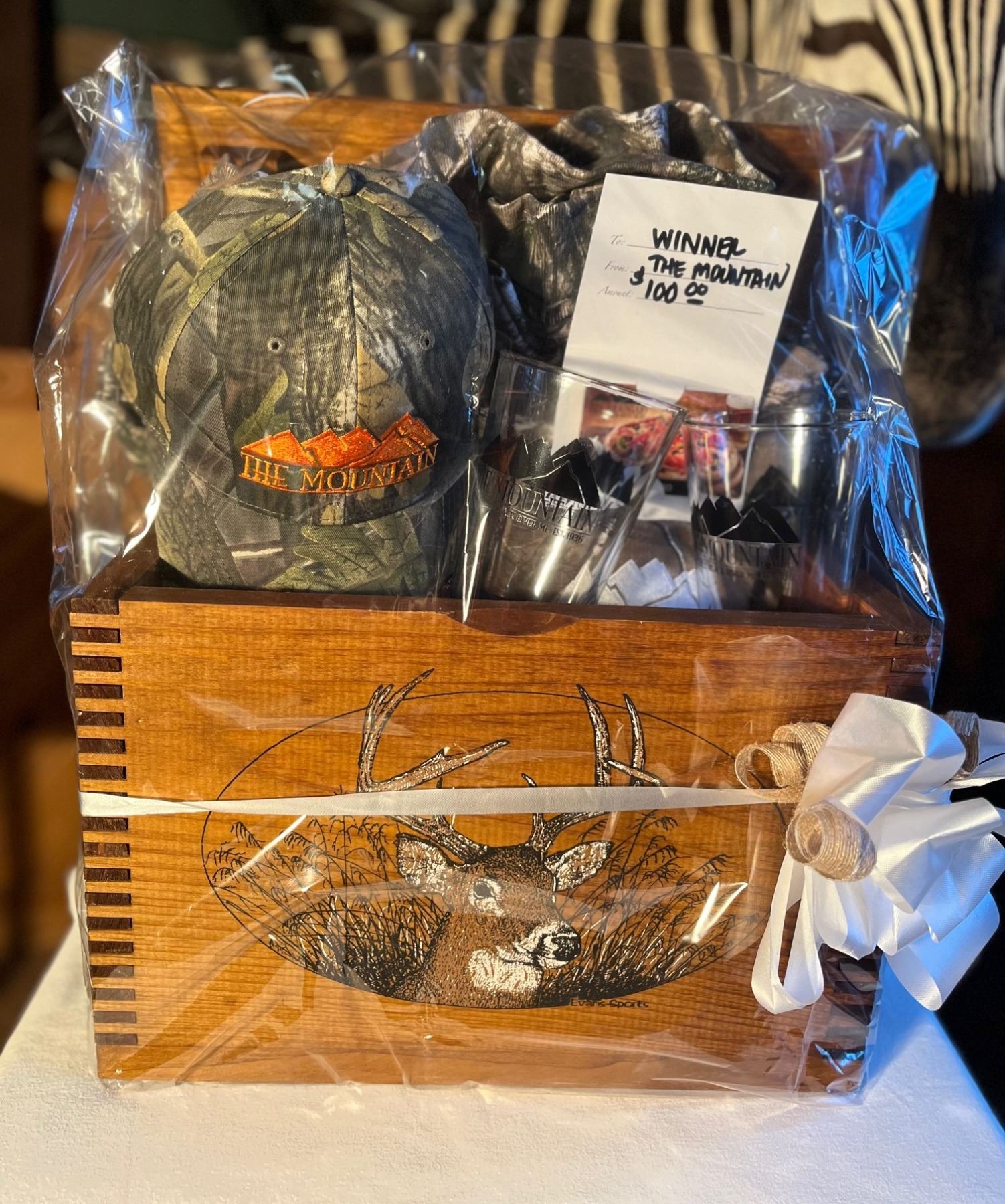 "The Mountain Bar & Grill" Gift Basket ($100 Gift Card, Beer Glasses, Camo Ball Cap/Shirt in a Whitetail Basket)