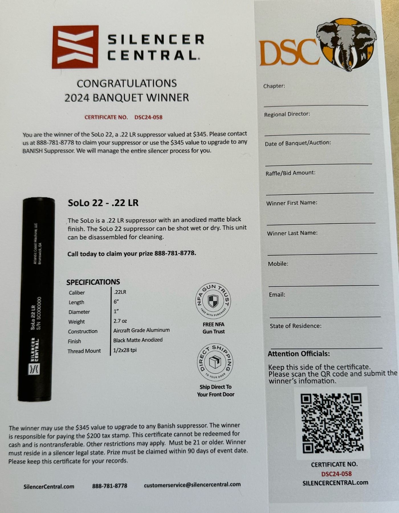 Lot 49 Silencer Central Solo 22 - .22LR Suppressor Certificate or $345 Upgrade to any Banish Suppressor