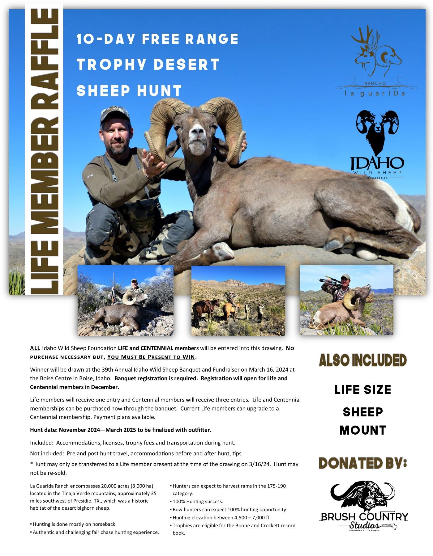 The 2024 Life Member Only Raffle is an Desert Sheep Hunt with Rancho La Guarida. This is a must be present to win raffle with banquet registration required.