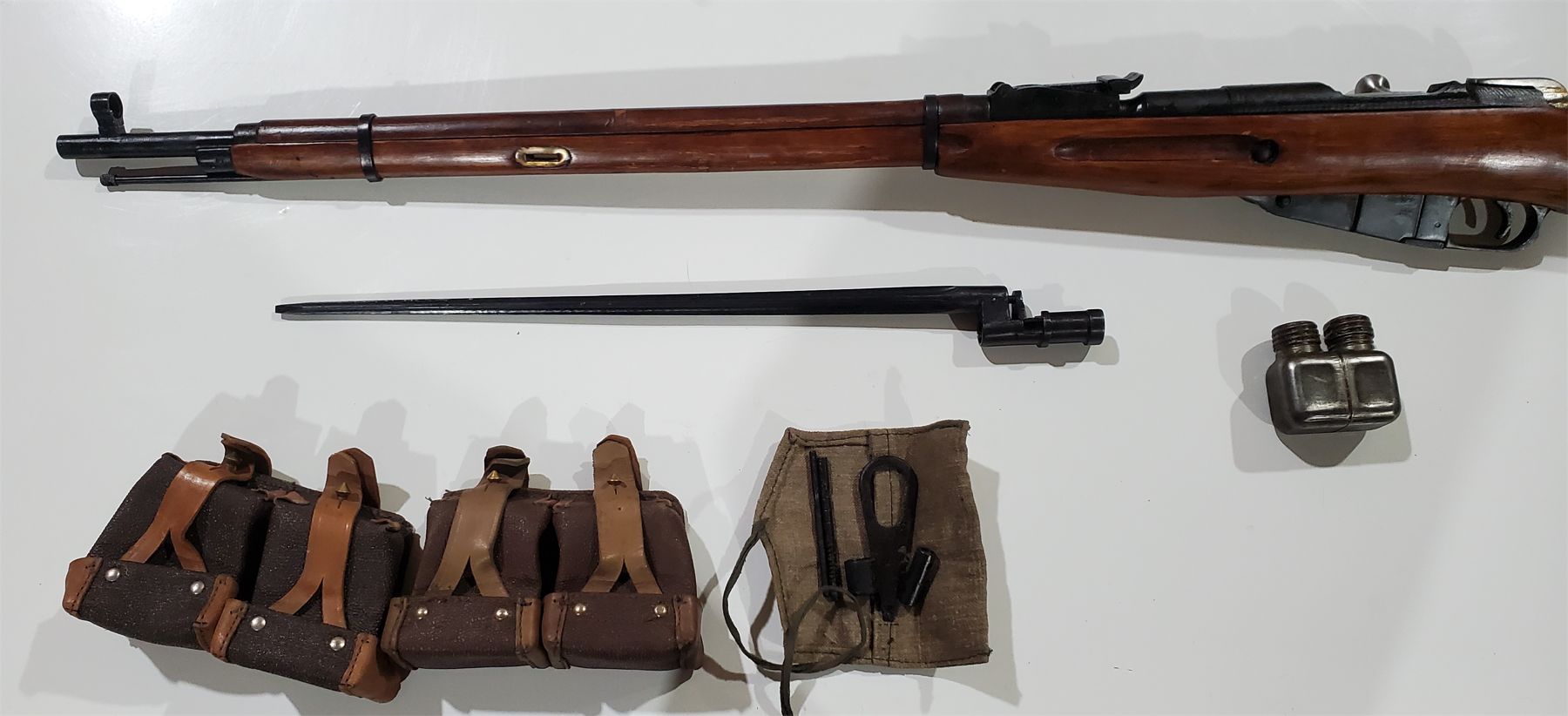 91/30 Mosin in excellent condition. All matching serial numbers and no rust anywhere on the rifle. Stock is in very good condition and bore has lots of rifling and no pitting. Produced at the Izhevsk arsenal in 1942 and comes with two magazine pouches, a bayonet, an oil bottle and cleaning kit.