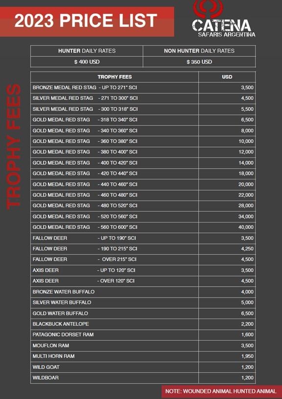 Trophies included: (To be shared by the hunters) 1 Blackbuck trophy fee 1 Patagonic Ram trophy fee 1 Wild boar trophy fee Daily Rates includes: - Reception at arrival to Santa Rosa City in La Pampa, and transportation to and from Hunting Camps. - Full-board accommodation based on double rooms, with wine and/or beer, drinks at meals and international Chef service. - Land transportation by cars and 4WD vehicles. - Primary trophy preparation. - Professional guide service 2 x 1. - English speaking host. - Laundry Service. - WIFI Internet service at all Lodges.