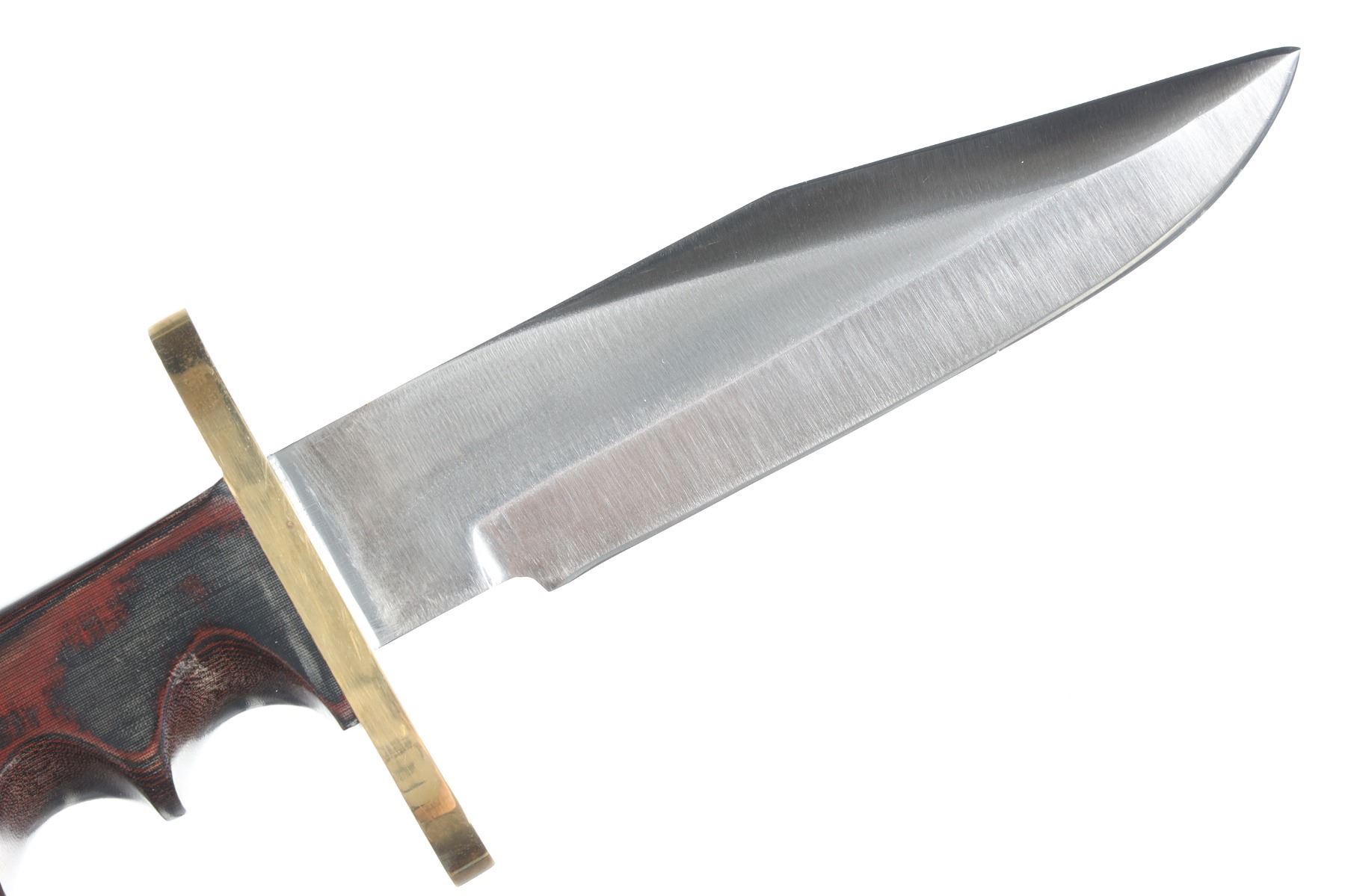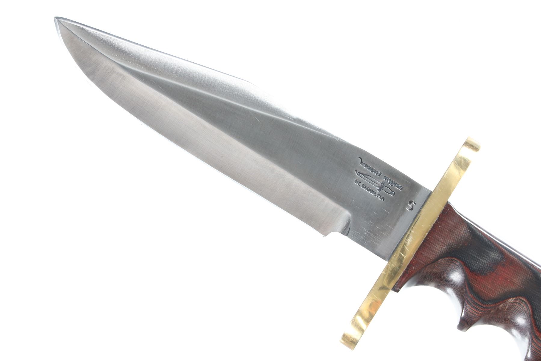 Hugh Wright of St, Cloud Florida is a former custom knife maker who worked under Randall Knives in Orlando Florida. Offered is his rendition of the Famed Model 15 Airman with 5 1/2" stainless blade with brass double guard and finger groove leaf Micarta handle with wrist thong. "Wright Knives" touchmark on ricasso and housed in a Kydex lined cordura scabbard with tie down thong. Condition: Extremely fine with no evidence of use.