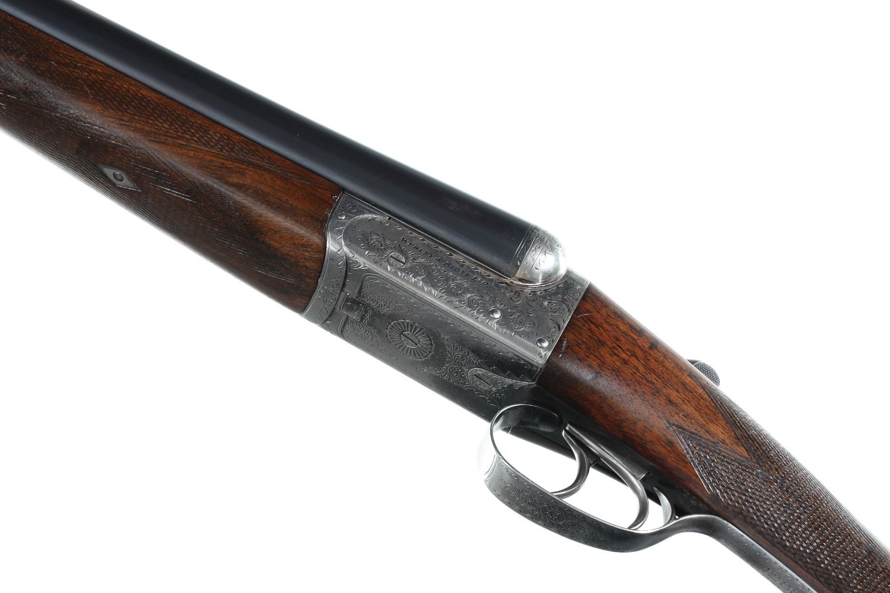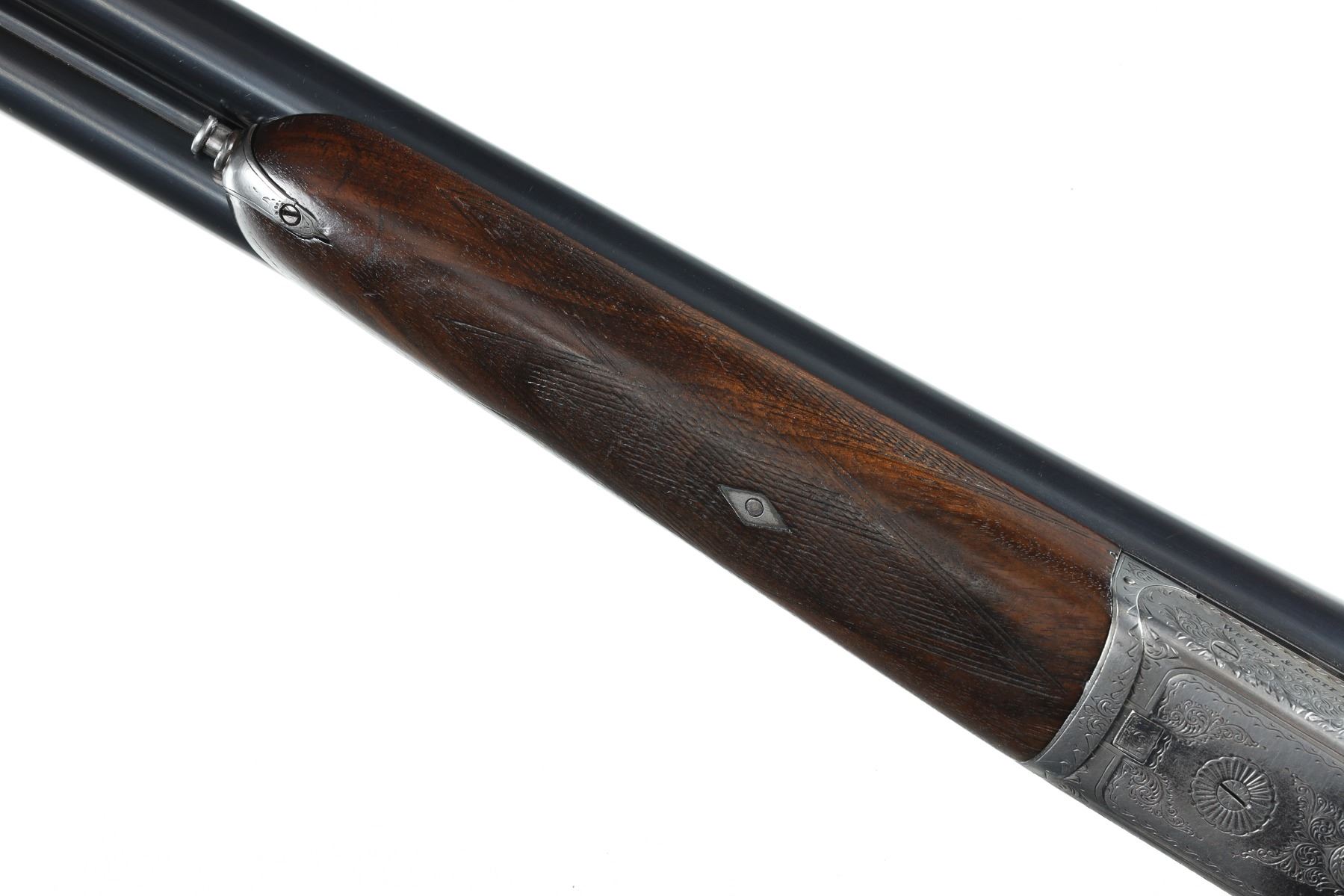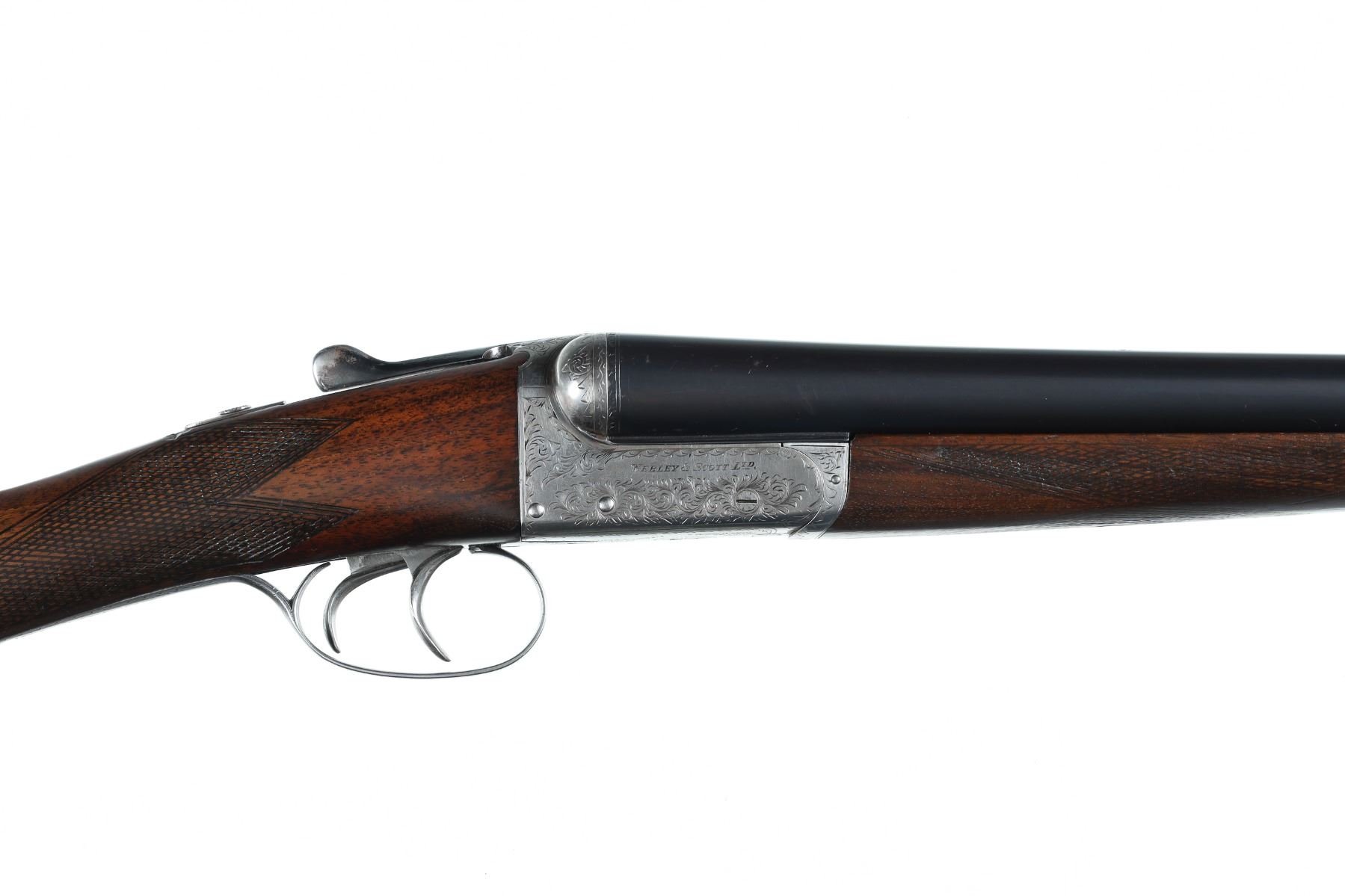 12ga Serial # 128858 Webley & Scott Model 700 Box lock double 12 ga, with double triggers with ejectors. 28" Bbl, choked with full and imp, cylinder chokes. 15" LOP with 1 3/8" & 2-3/8" drop. Condition, Very fine with receiver having toned to silver with scroll engraving . Barrels marked Webley & Scott. English refinished and retaining most all barrel blue. Mechanically excellent. C&R. Mfg in 1958 Barrel 28 C&R