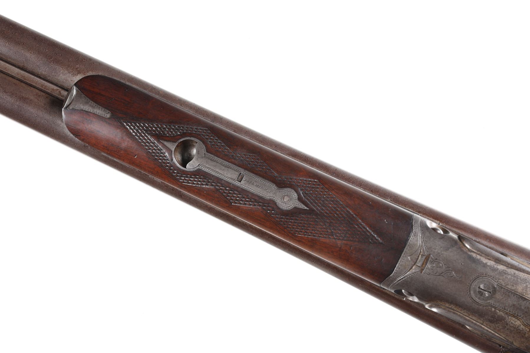 10ga Serial # 19004 Very early Parker Brother Underlifter 10ga hammer double shotgun. Damascus Bbl, with varnished walnut pistol grip stocks. Very good overall condition, sling swivel mount removed from toeline. Chambers measure 3", LOP 14". Mfg 1880. Mechanically excellent Barrel 30" NO4473