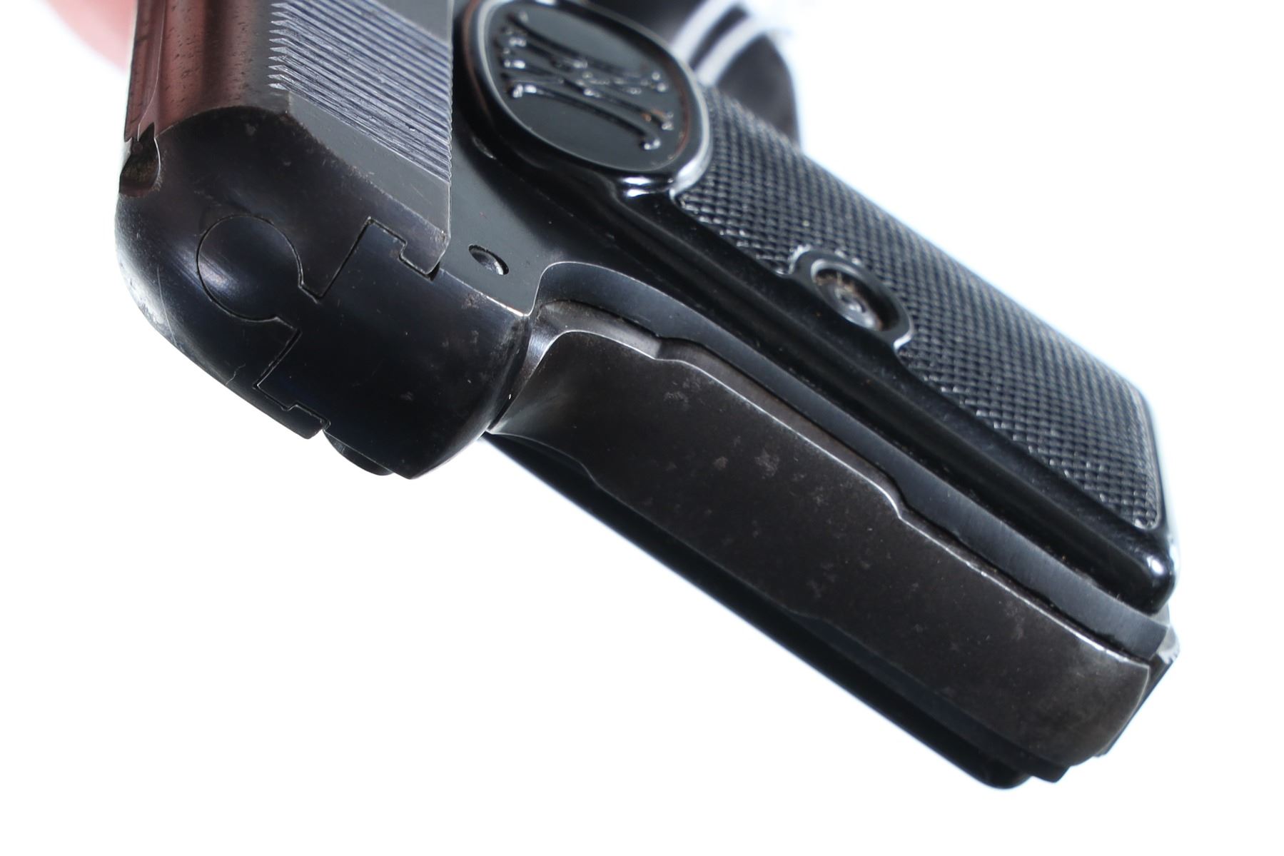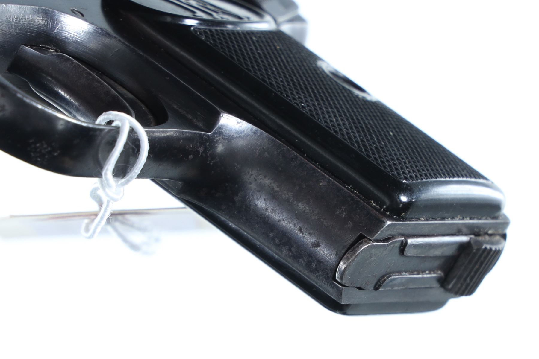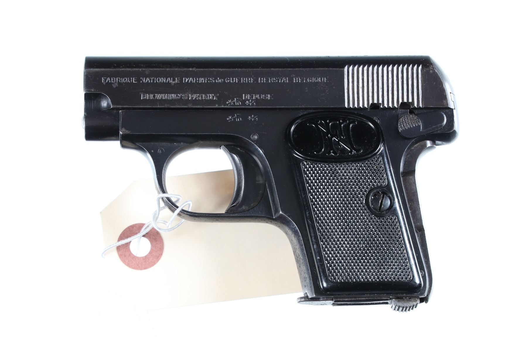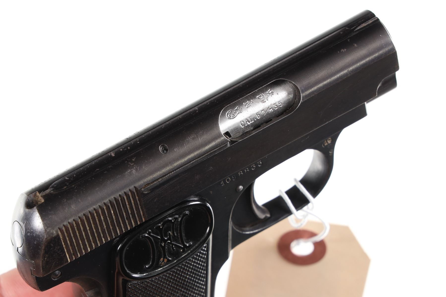 6.35 mm Serial # 1058833 Blue finish, factory checkered grips. Fine overall condition, mechanically excellent. Barrel 2 1/4" C&R