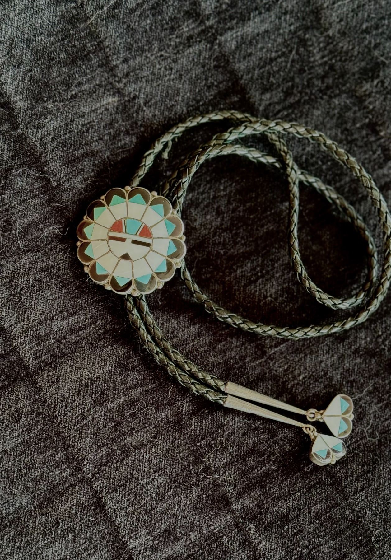 Vintage, Zuni Indian Inlay Bolo Tie with Sun Face and inlaid silver tips. Made of Sterling Silver, Mother of Pearl, Turquoise, jet and coral, and real leather.