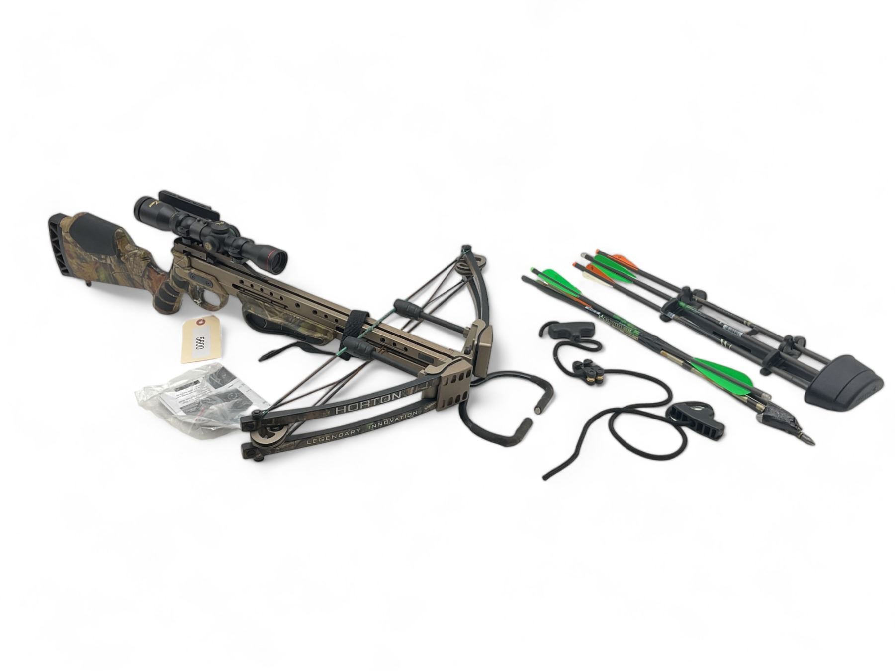 Horton Ultralight Express Crossbow With Case Bolts And Excalibur Scope. Scope is a Excalibur Shadow one with range finder mount as well. Includes 7 bolts, quill rope cocking aid and hard plastic case.