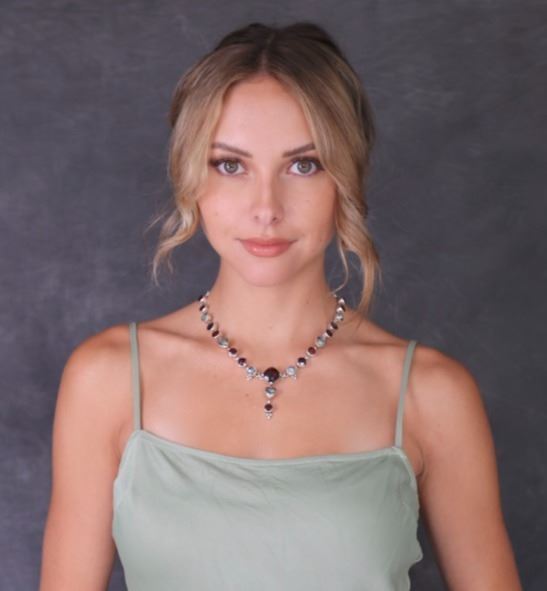 Thanks to Genesis Fine Jewelry, this custom sterling silver necklace set is made of genuine garnet and mystic topaz stones.