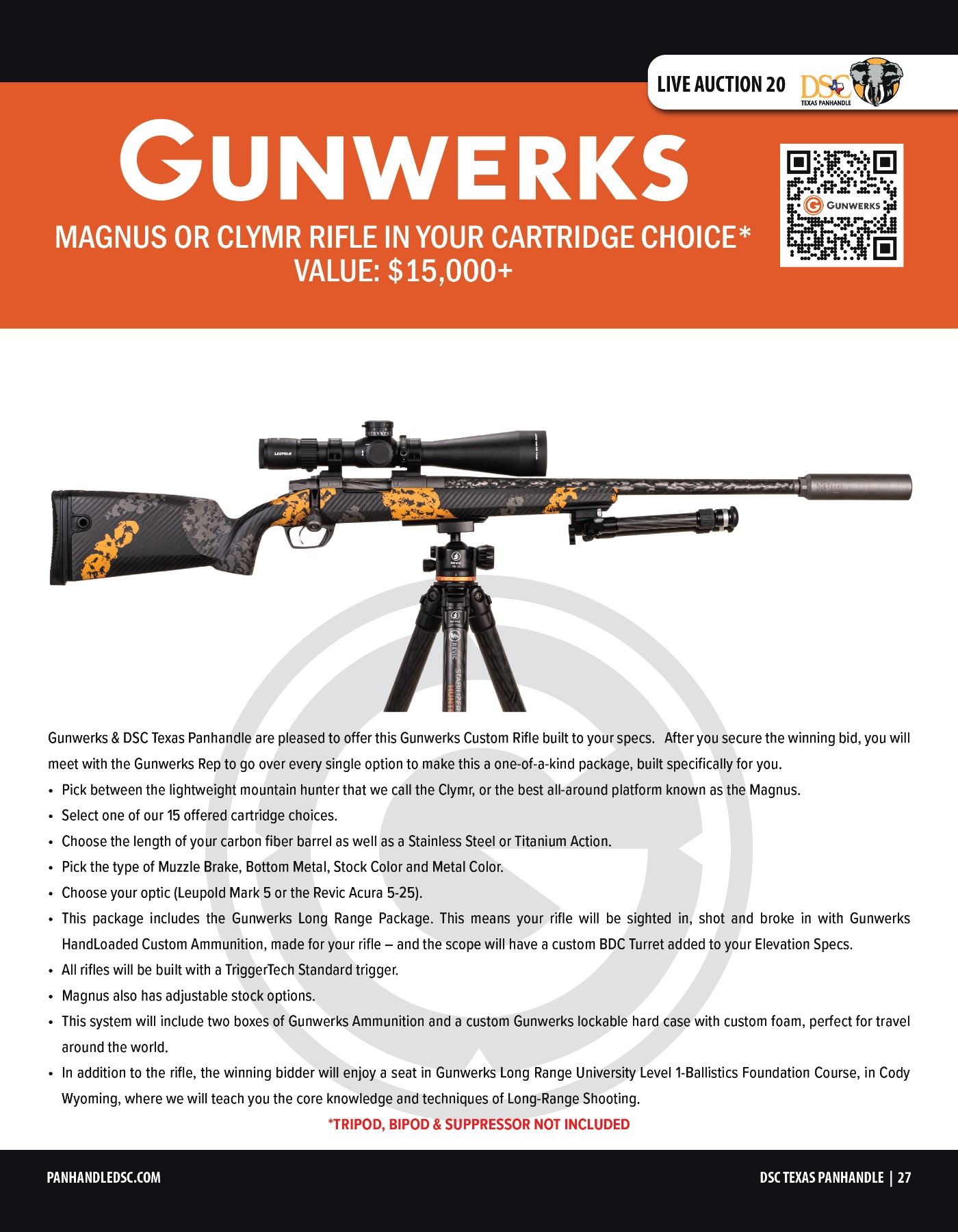 Gunwerks & DSC Texas Panhandle are pleased to offer this Gunwerks Custom Rifle built to your specs. After you secure the winning bid, you will meet with the Gunwerks Rep to go over every single option to make this a one-of-a-kind package, built specifically for you.