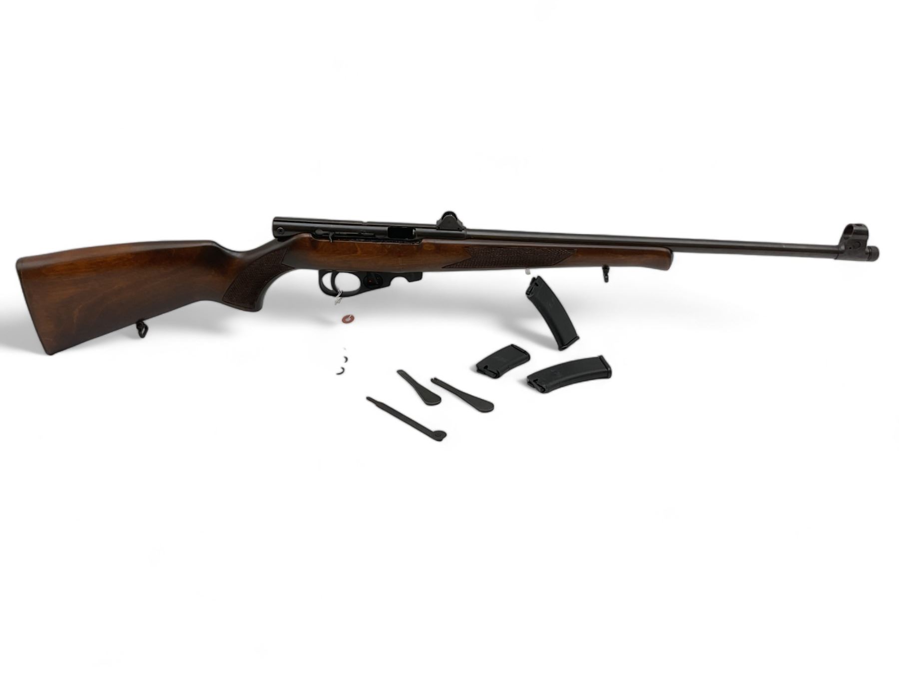 Baikal Toz 99 Semi Auto Rifle 22LR 21" Threaded Barrel Wood Stock Parts Gun. Front sight broken, adjustable rear sight. Magazine catch missing; mags will not lock in. Comes with 3 detachable magazines. Bolt is jammed to rear of receiver; unsure if parts missing. Safety will not operate. This is a non-restricted firearm.