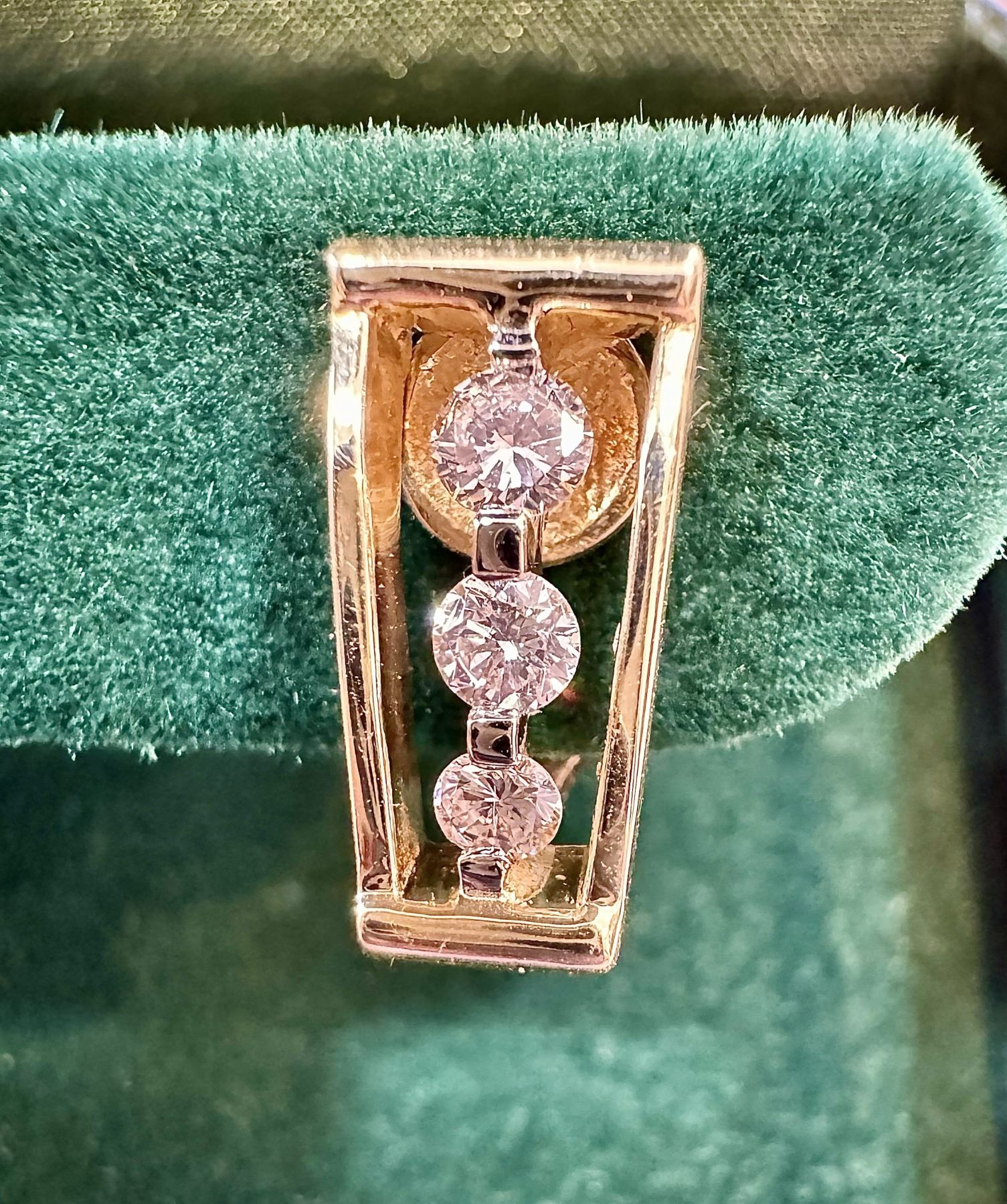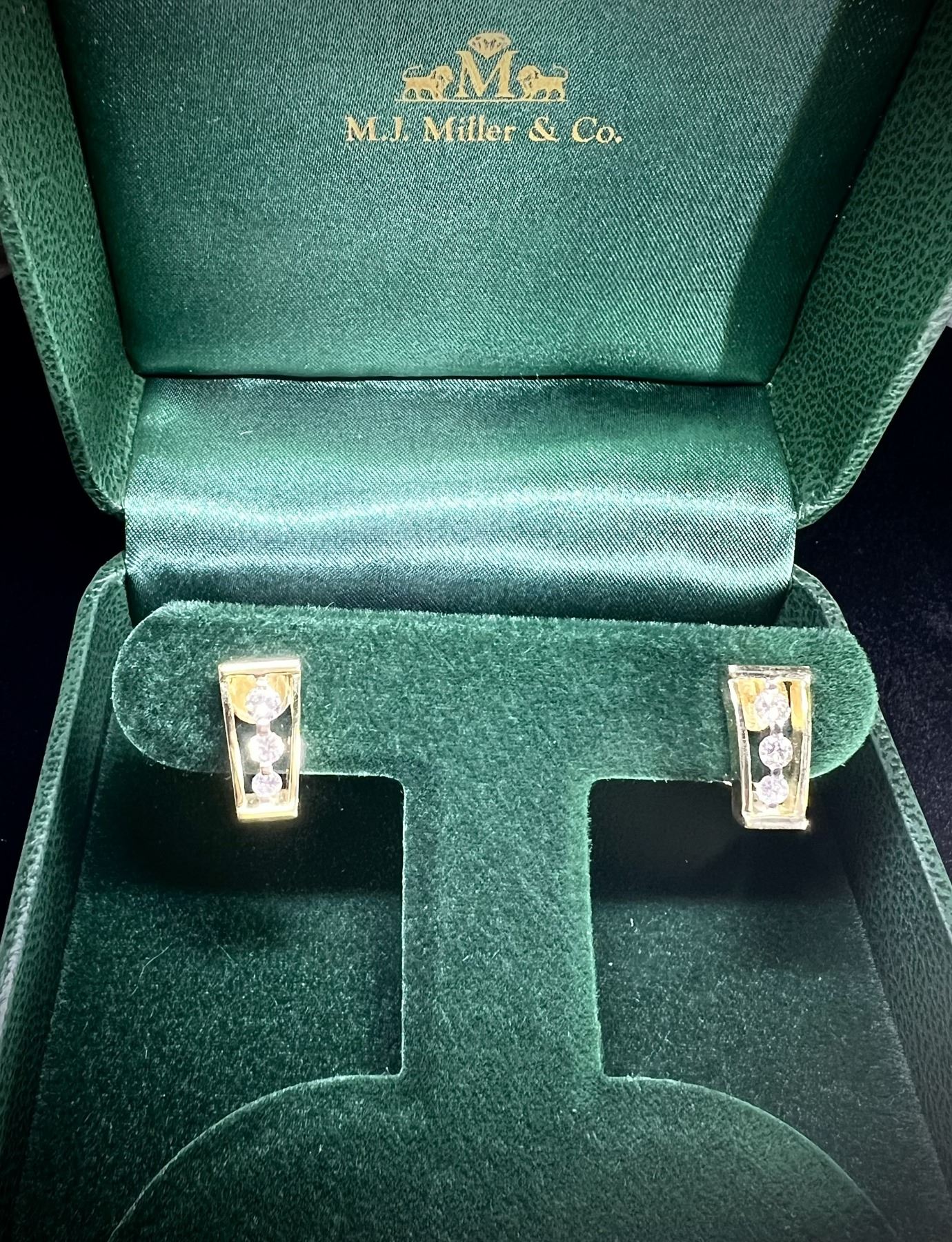 The brilliant sparkle of these earrings is guaranteed to put a twinkle in her eye! Three round full cut diamonds are channel set on each earring. The six diamonds are VS clarity with excellent cut and polish, with a total weight over .5 carats. The settings are 18K yellow and white gold with a highly polished finish. The backs are post and omega clips. These earrings will be worn with pride and will attract attention and envy from the women who value fine jewelry. These earrings include a certified appraisal document for insurance purposes. Value: $6,500.