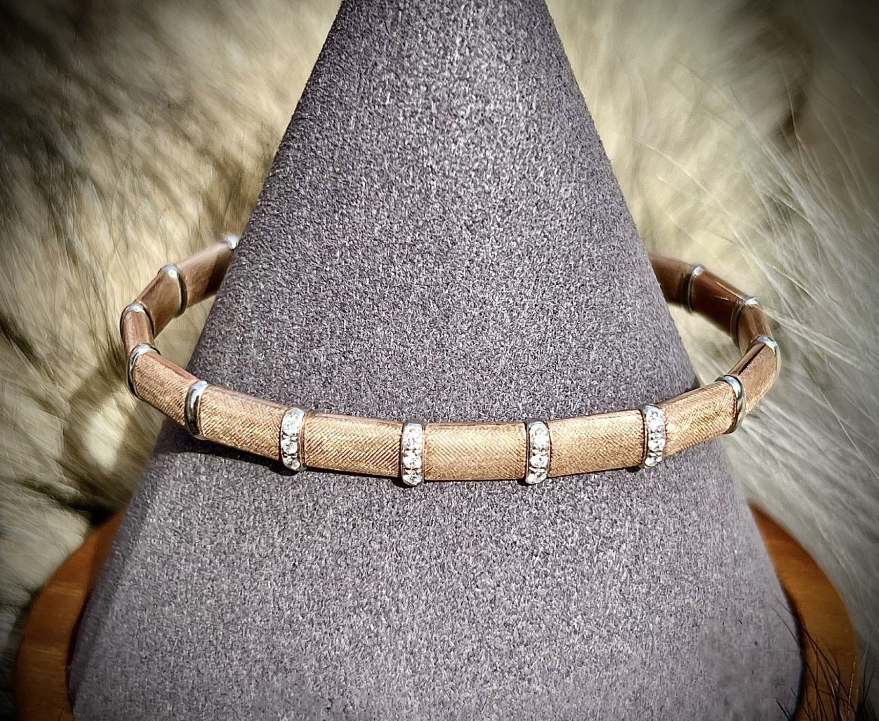 This bracelet is truly unique! It is made of rose gold plated 18K white gold, with 12 round cut diamonds set in sterling silver bands across the rose gold body. The rose color of the bracelet alone makes it stand out, and the 12 sparkling diamonds give that extra elegance that every lady wants. The diamonds are VS clarity with excellent cut and polish. The body of the bracelet is 6mm wide, comprised of 16 grams of 18K gold with sterling silver accents. It boasts a Florentine finish, which is a specialist engraving technique that has been passed down from one master craftsperson to the next, leaving it relatively unknown to those outside of traditional Italian workshops. A Florentine finish is achieved by hand, with great patience and hand-eye coordination needed to make each line perpendicular and evenly spaced. This beautiful bracelet takes its inspiration from Florence, Italy, and its owner will be inspired to wear in on many occasions. Value: $4,500