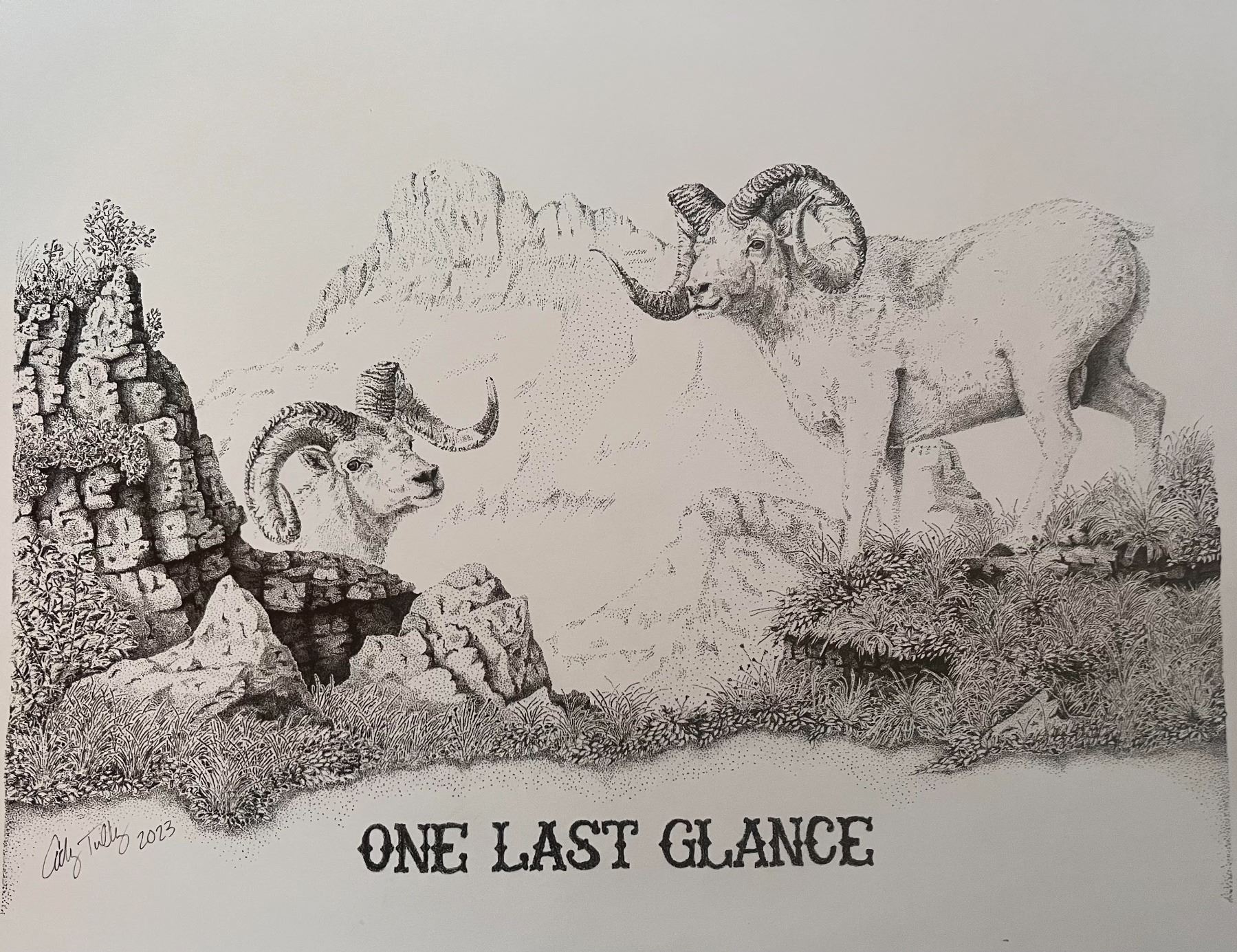 #19 Lot 19 "One Last Glance" framed, stippled drawing by Cody Tully