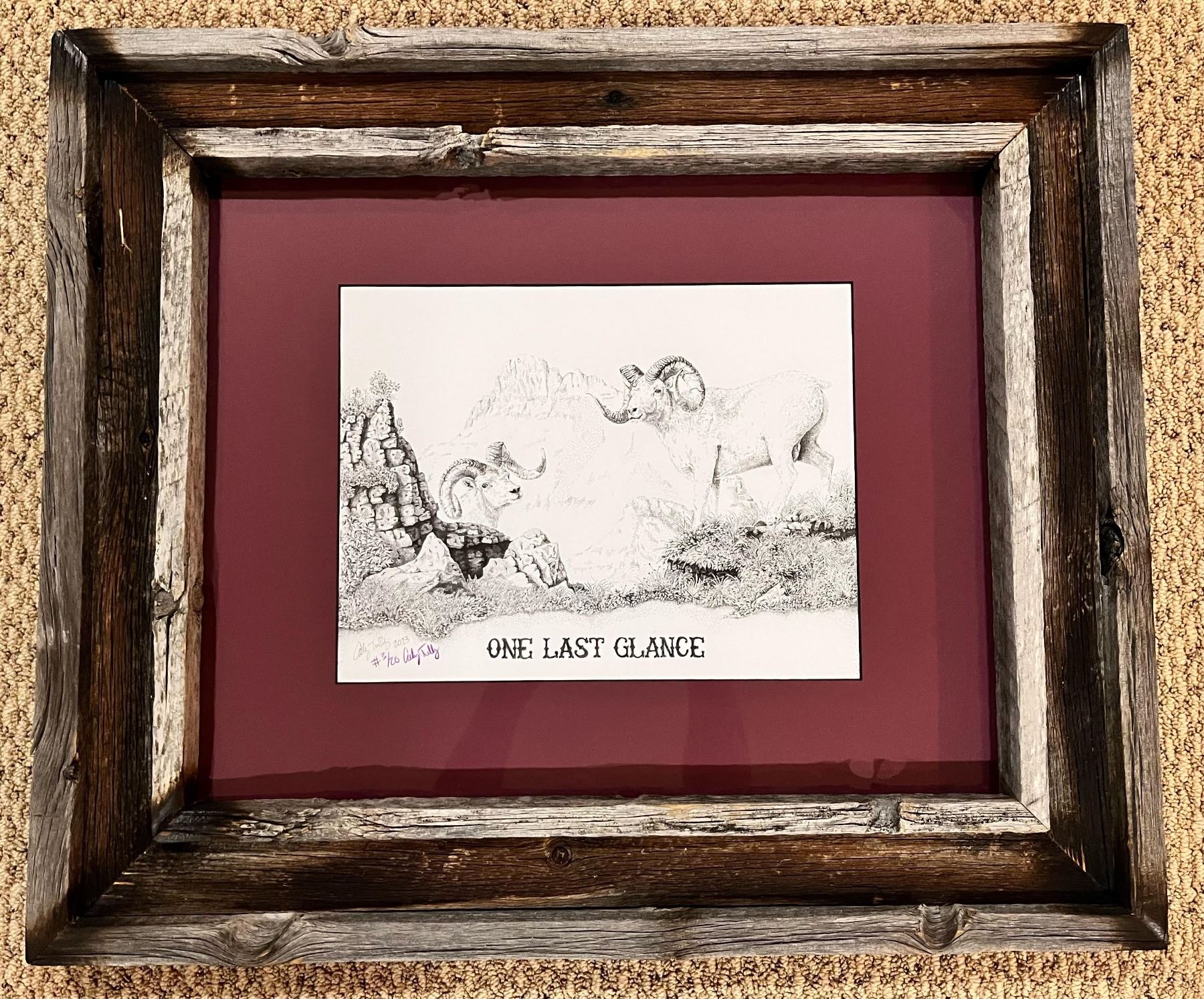 Description: "One Last Glance" stipple drawing framed at 20"X24". Third in a series of four grand slam drawings.