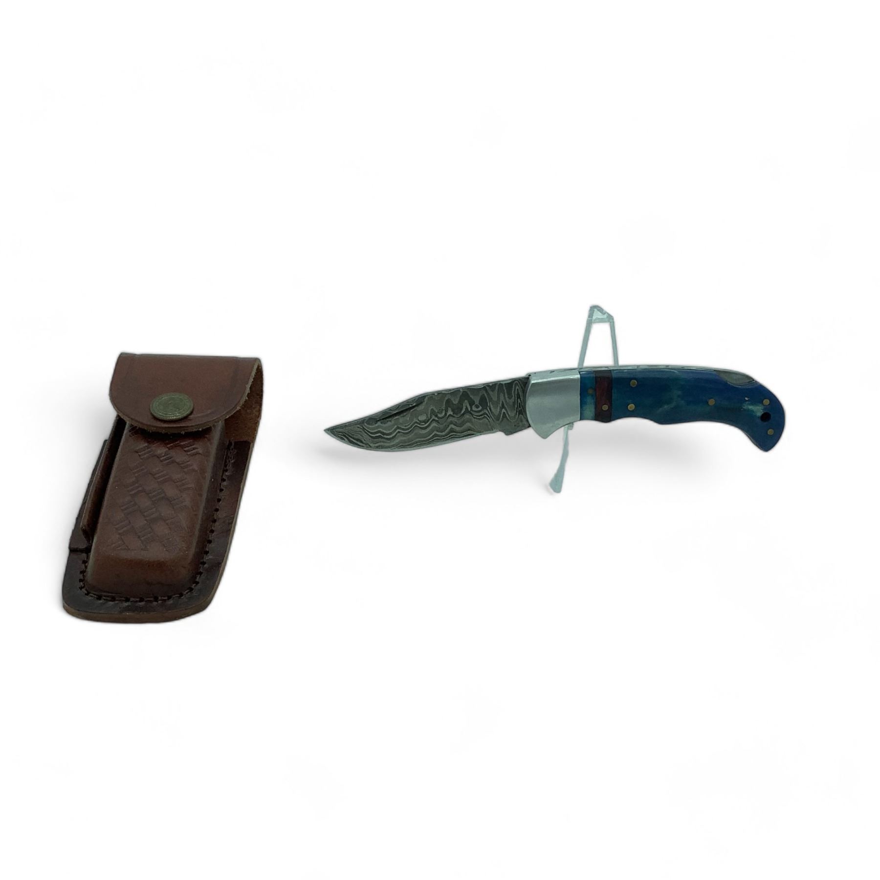 Lot 187 Hand Forged Damascus Folding 2 1/4" Blade Knife with Belt Sheath