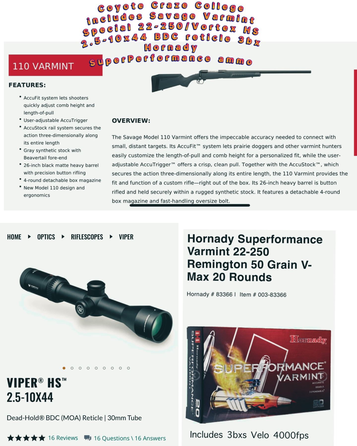 “Coyote Craze College” adventure, a comprehensive classroom multimedia course day and then 2 days in the field with aprx 30 "stands” with one-on-one guidance from Geoff Nemnich, arguably the best coyote caller in the USA where you will learn the secrets of this growing and exciting hunting pastime. This auction also includes a new Savage 110 Varmint Special 22-250, with a Vortex HS 2.5-10x44 BDC, and 3 Boxes of Hornady Superperformance 50g v-max ammo, bi-pod, hard case.